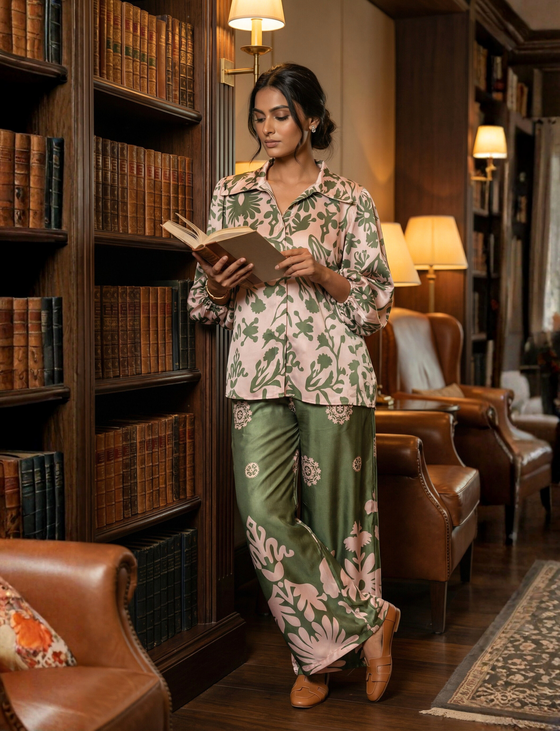 The Classic Era Set features a rich wine satin shirt paired with elegant camel brown...