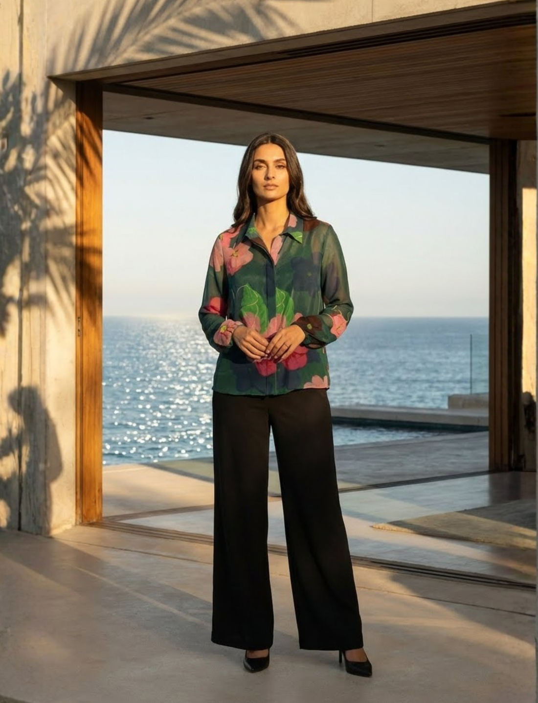 The Classic Era Set brings together a rich tan satin shirt and sleek black wide-leg...