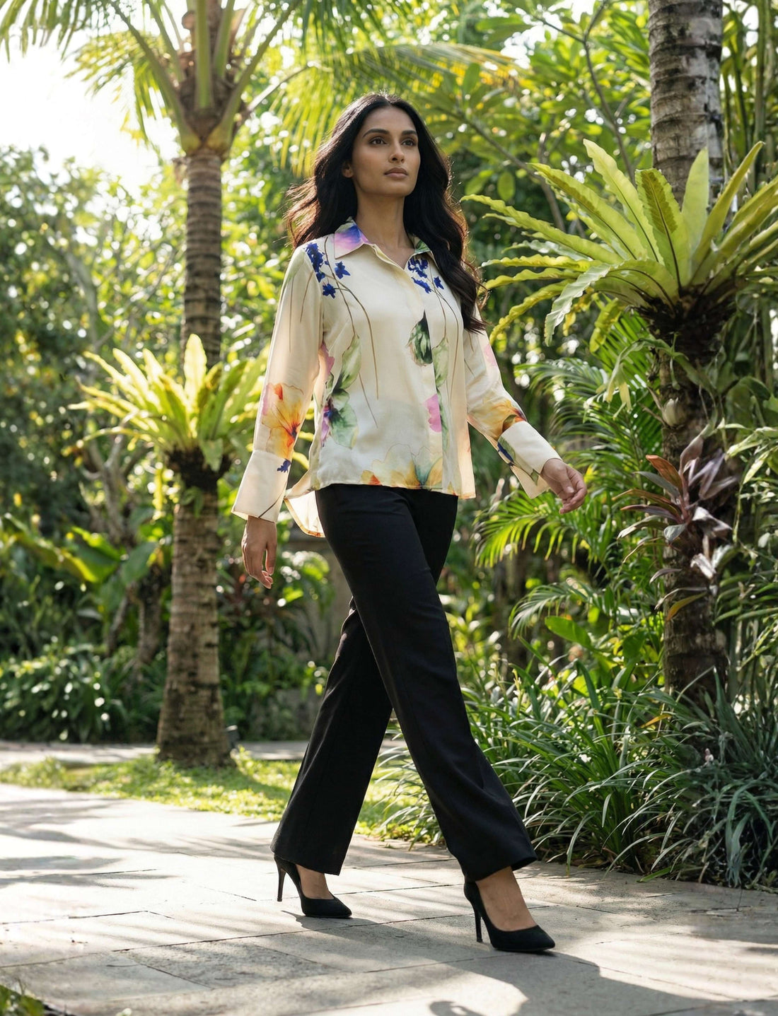 A tailored shirt crafted in a soft cream base floral print, featuring a short structured...