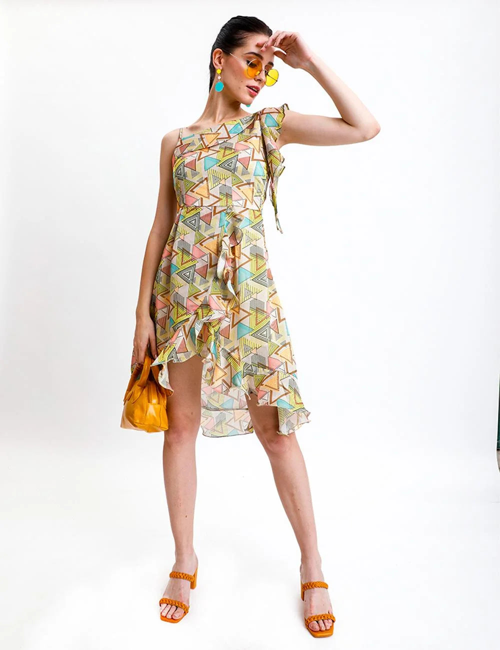 Product DetailsType: Asymmetrical DressFit: ComfortableNeckline type: One ShoulderSleeves styling: Ruffle StylingPattern: GeometricalFabric: Modal SatinColor: Multi...
