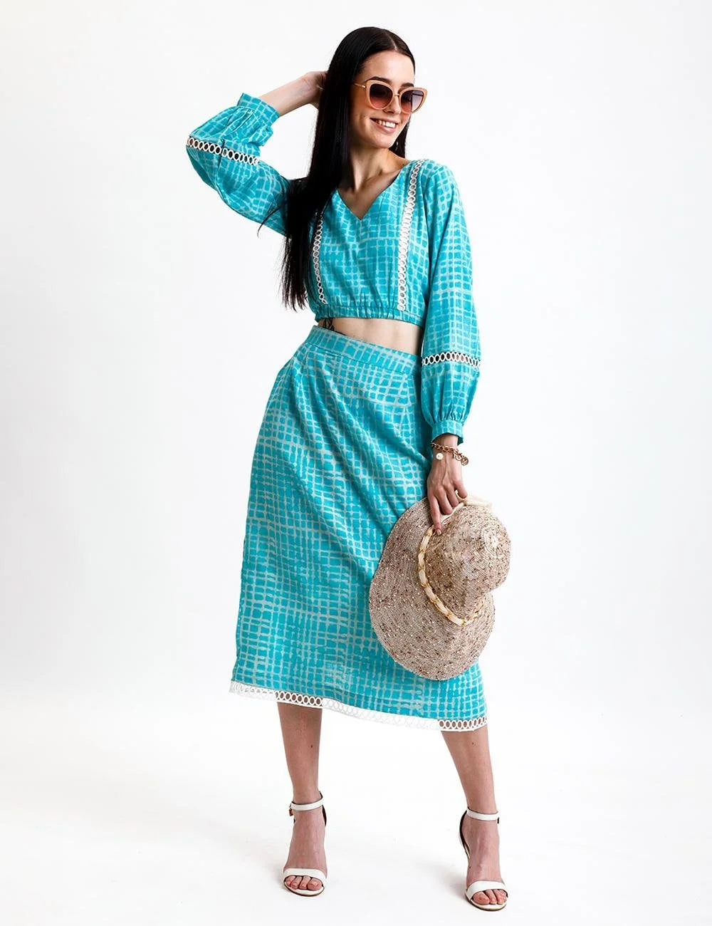 Aquarius Blue Tie And Dye Top Skirt, Has A V Neck, Puff Sleeves With Lace...
