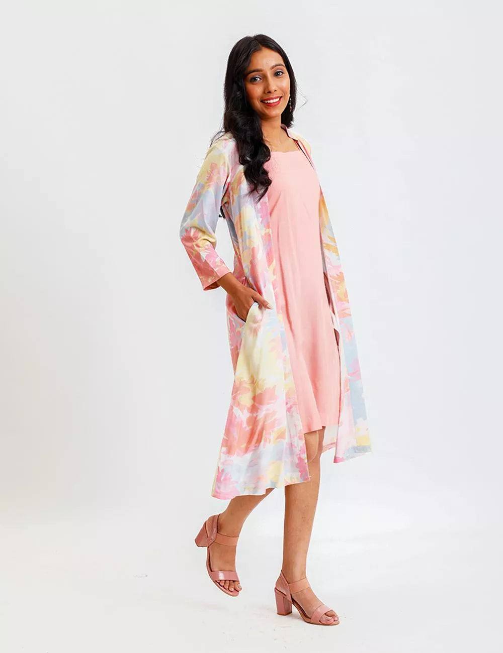 Product DetailsType: A-line dress with jacketFit: ComfortableNeckline type: Mandarin collarSleeves styling: RegularPattern: FloralFabric: RayonColor: PeachLength:...