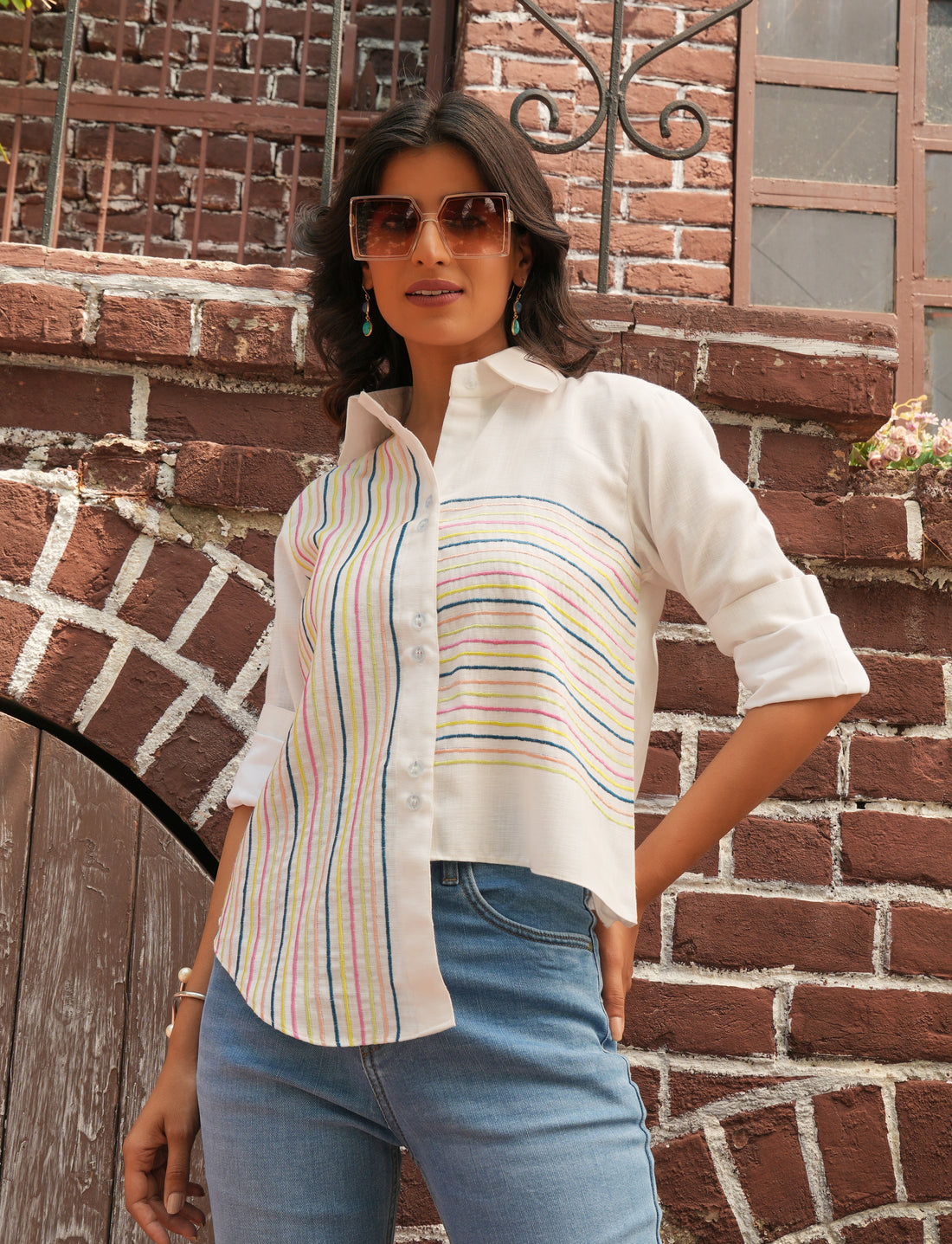 The Artline Embroidery Shirt is crafted from breathable linen and features delicate multicolour line embroidery...