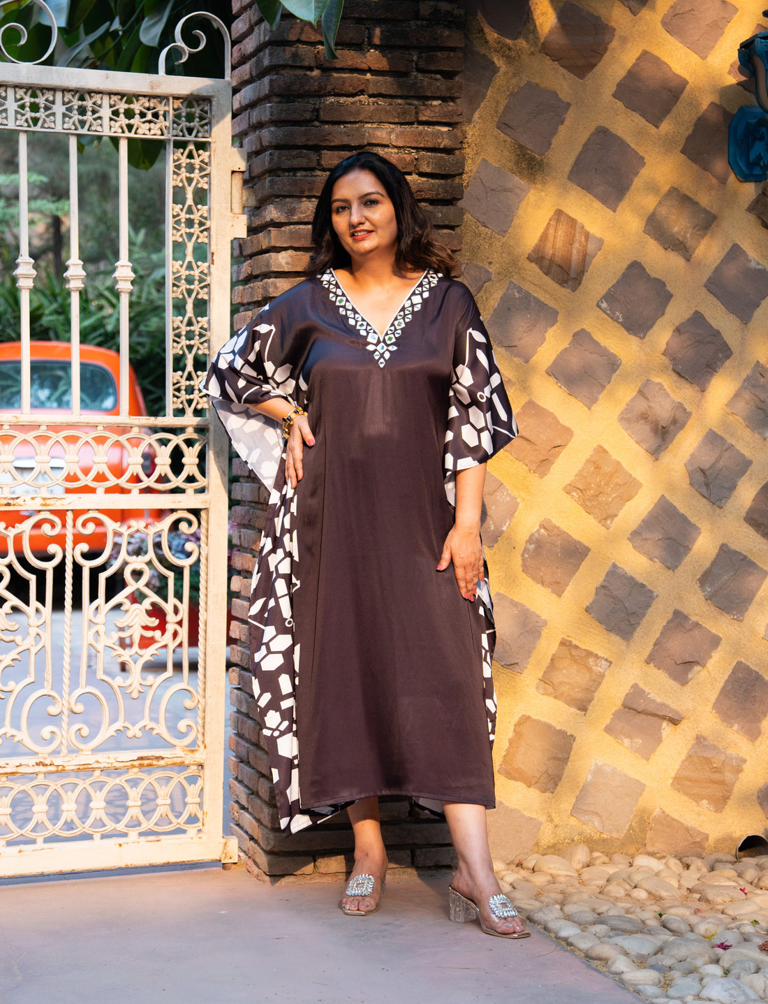Description: Abstract printed kaftan with a V neckline embellished with mirror work. It is a...