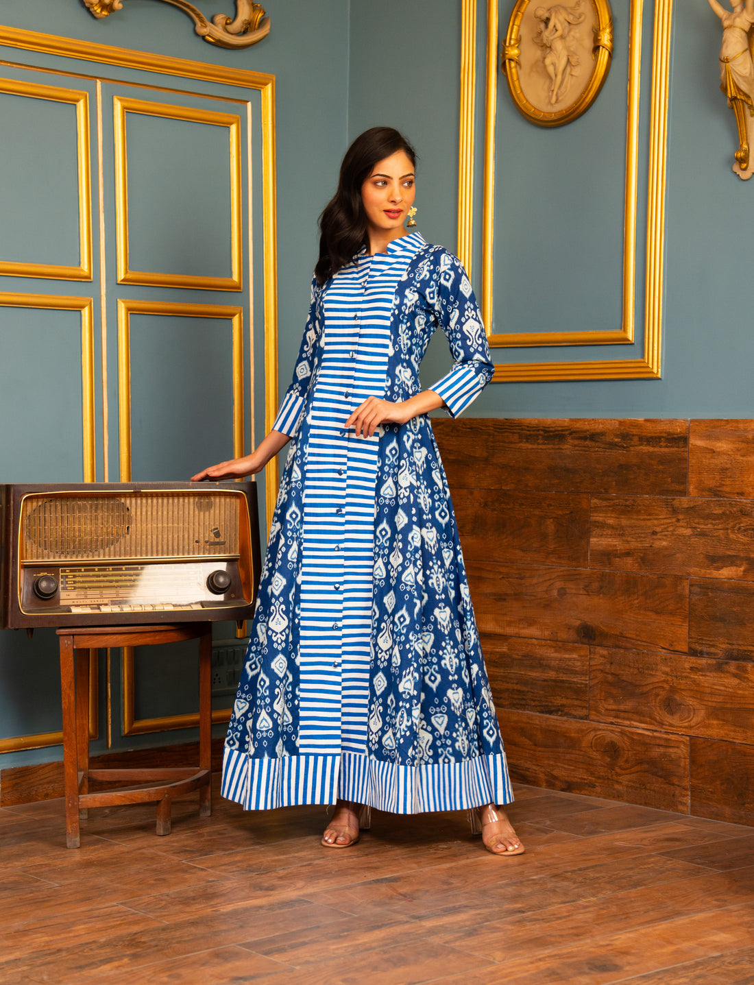This indigo ikkat printed dress with stripes fabric has a mandarin collar. This dress comes...