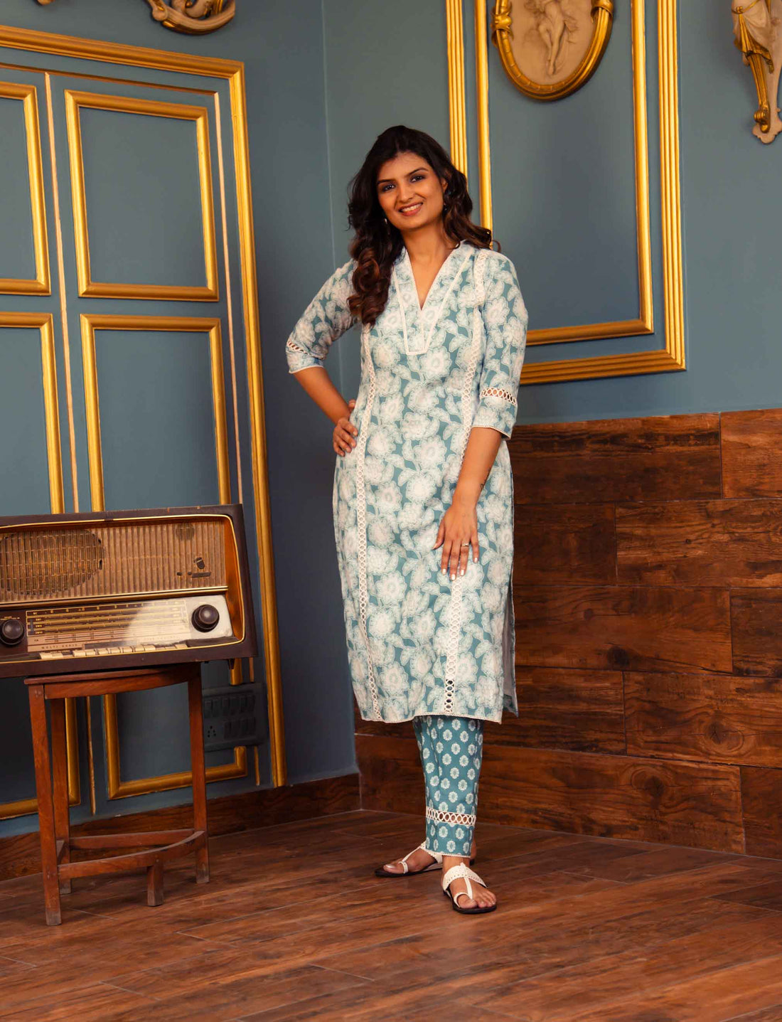 Lace embellished kurta set featuring a continuous V neckline with lace, 3/4th sleeves with lace....