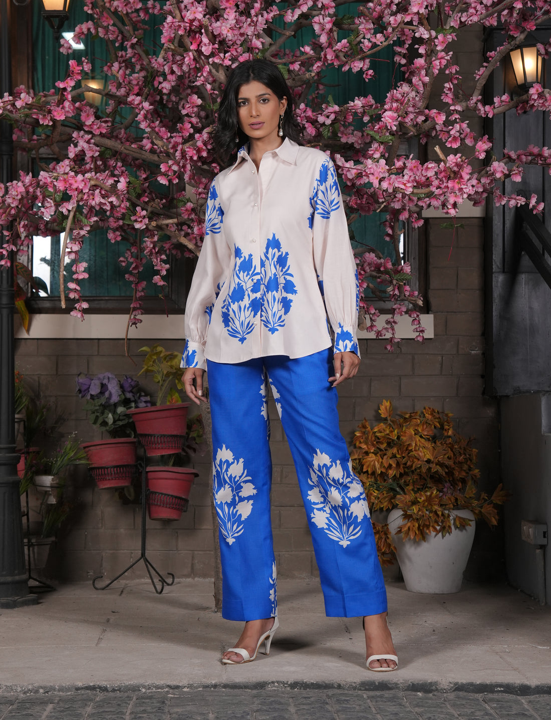 The Indigo Bloom co-ord set features a crisp shirt collar with pearl down front and...