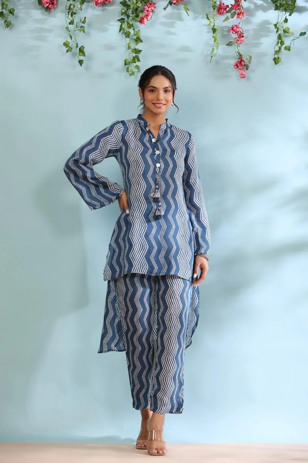 Product DetailsType: Muslin Kurta setNeckline type: Mandarian CollarSleeves styling: Bell SleevePattern: Zig Zag AsymmetricalFabric: MuslinColor:...