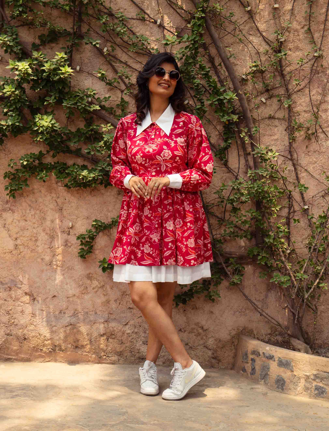 Description: Floral printed dress has a plain contrast modern collar, puff sleeves with plain cuffs,...