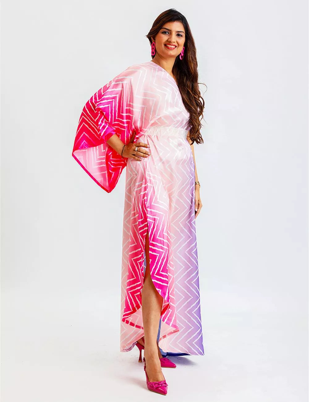 Ombre Zig Zag Pattern One Shoulder Kaftan Dress Has Bell Sleeve, Side Slit With Cascade...