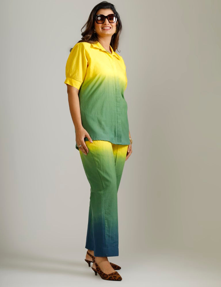 Description:Shirt style pure cotton co-ord set in hand-dyed ombre. It features a shirt collar...