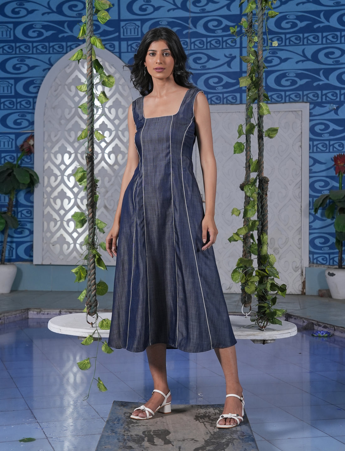 This sleeveless midi dress features a sharp square neckline and a flattering panelled silhouette that...