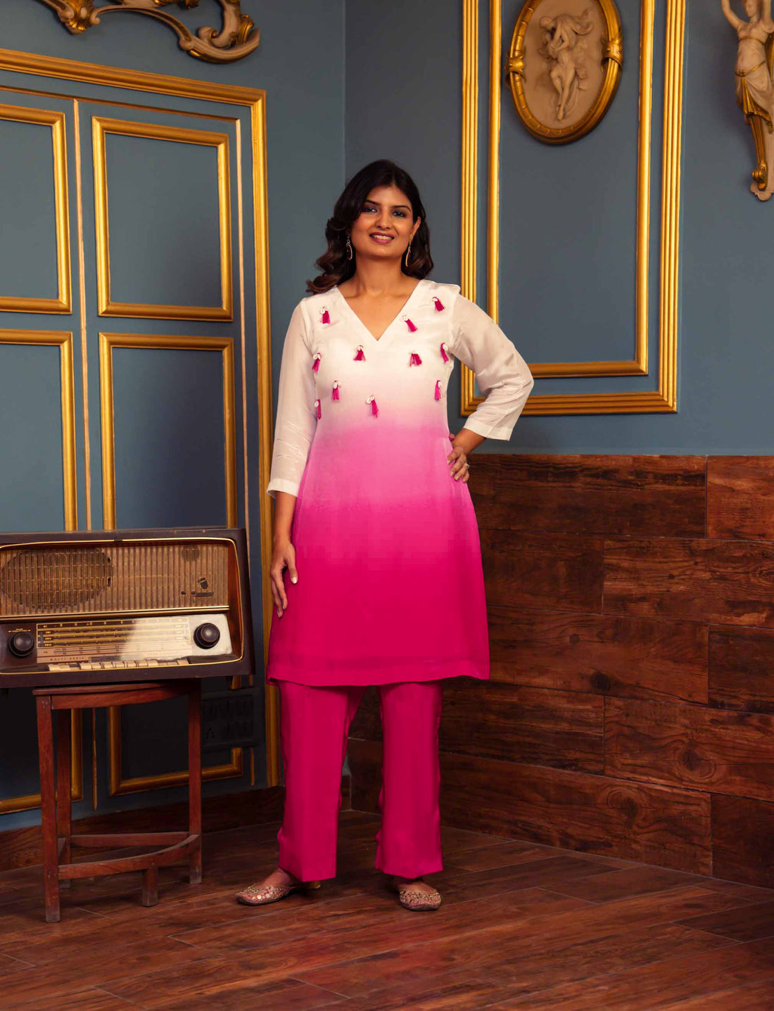 Ombre co ord set features a V neckline, 3/4th sleeves, yoke embellished with tassels and...