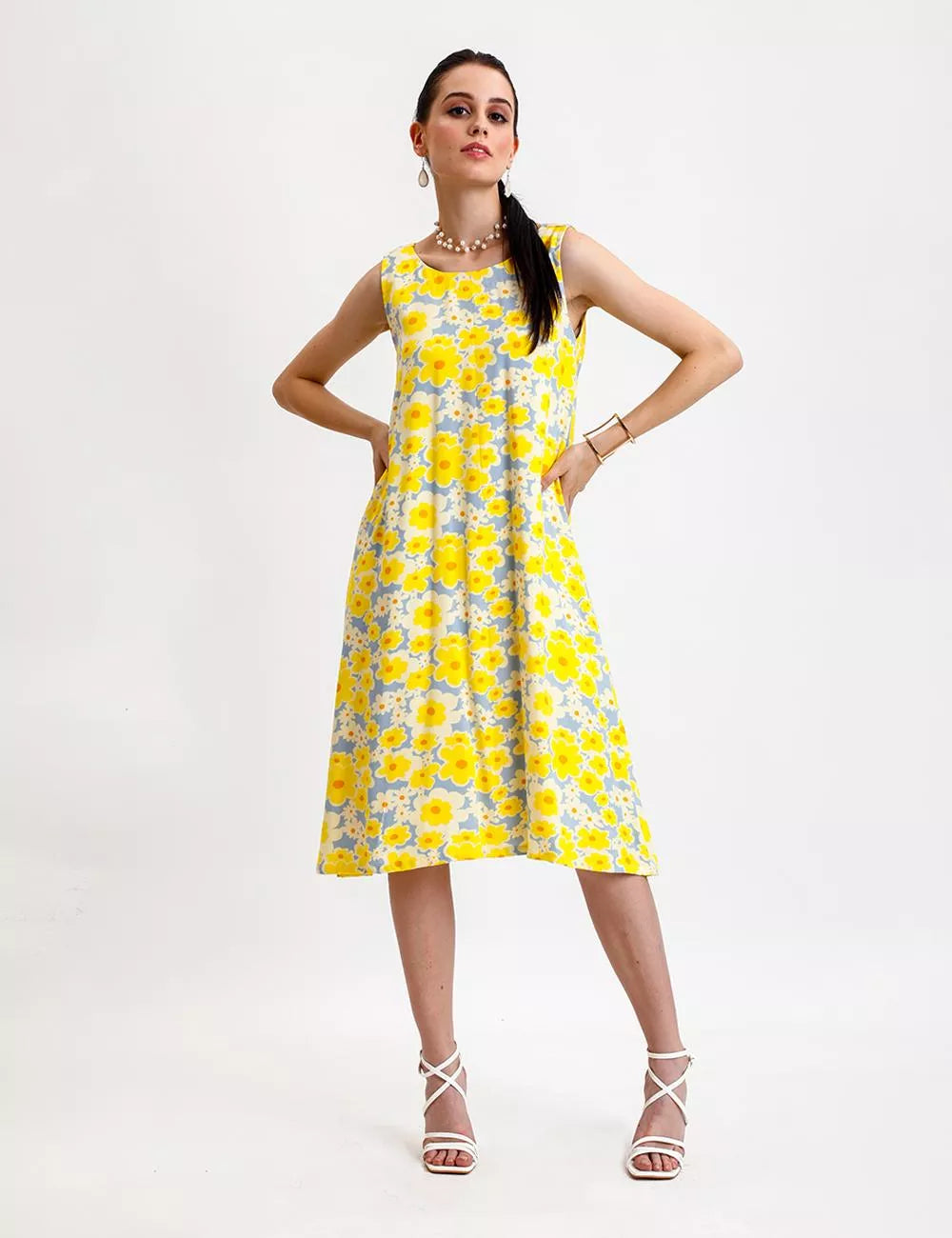 Product DetailsType: A-line dressFit: Loose and comfortableNeckline type: RoundSleeves styling: SleevelessPattern: FloralFabric: RayonColor: Lemon yellow...