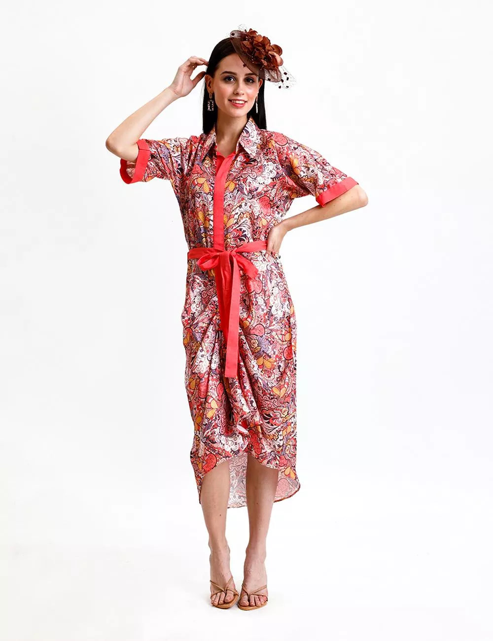 Zara Printed Button Down High Low Cowl Dress With Shirt Collar, Short Kimono Sleeves Attached...