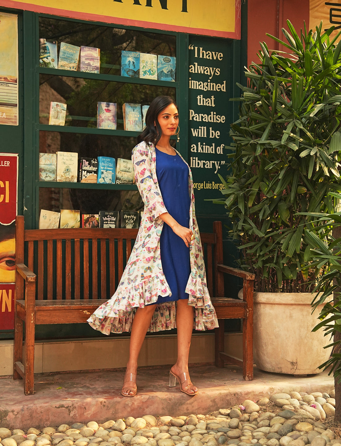 Description: Butterfly printed shrug set featuring 3/4th sleeves, ruffle gathered high-low hemline. It includes a...