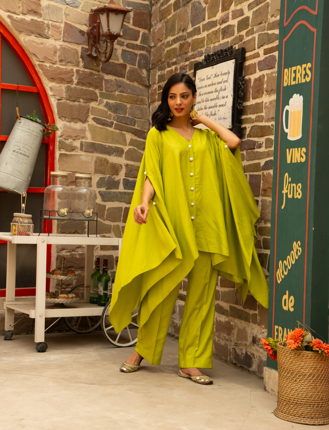 Green cape style co-ord set with asymmetric sleeves and hemline, front button placket, embellished with...