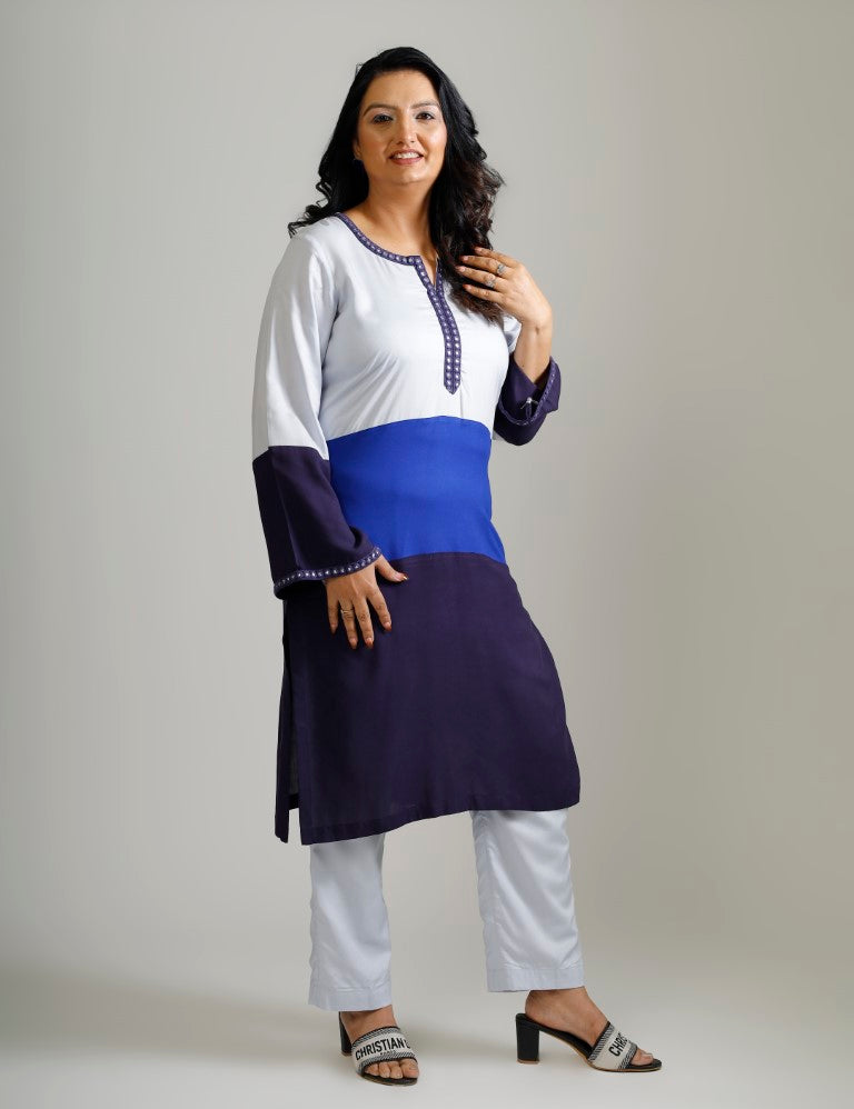 Introducing a three-colour blocking Kurta pant set. The set features a colour blocking design in...