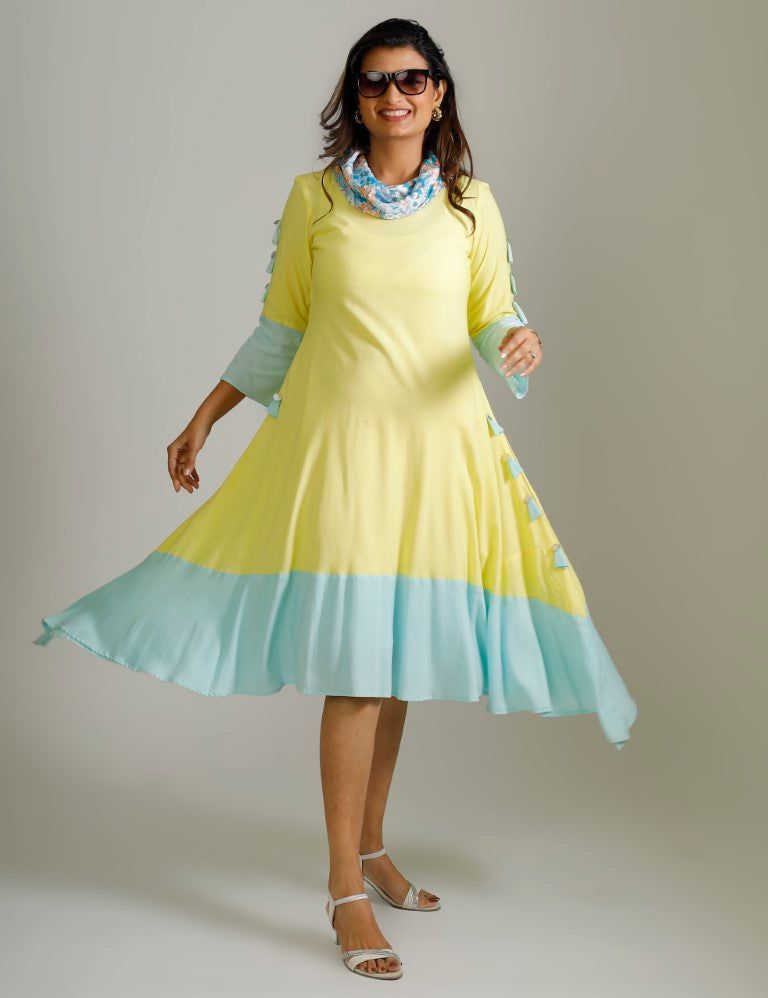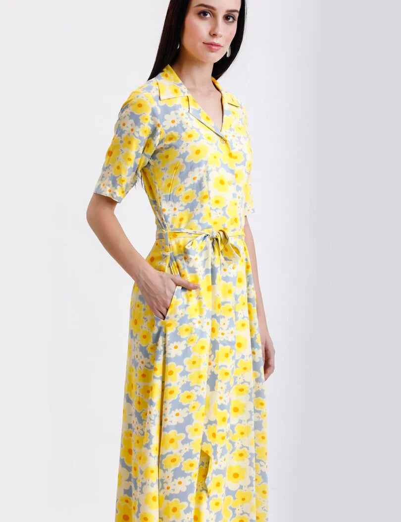 Product DetailsType: Floral Shirt DressNeckline type: Notched CollarSleeves styling: ShortPattern: FloralFabric: RayonColor: Yellow and BlueLength:...