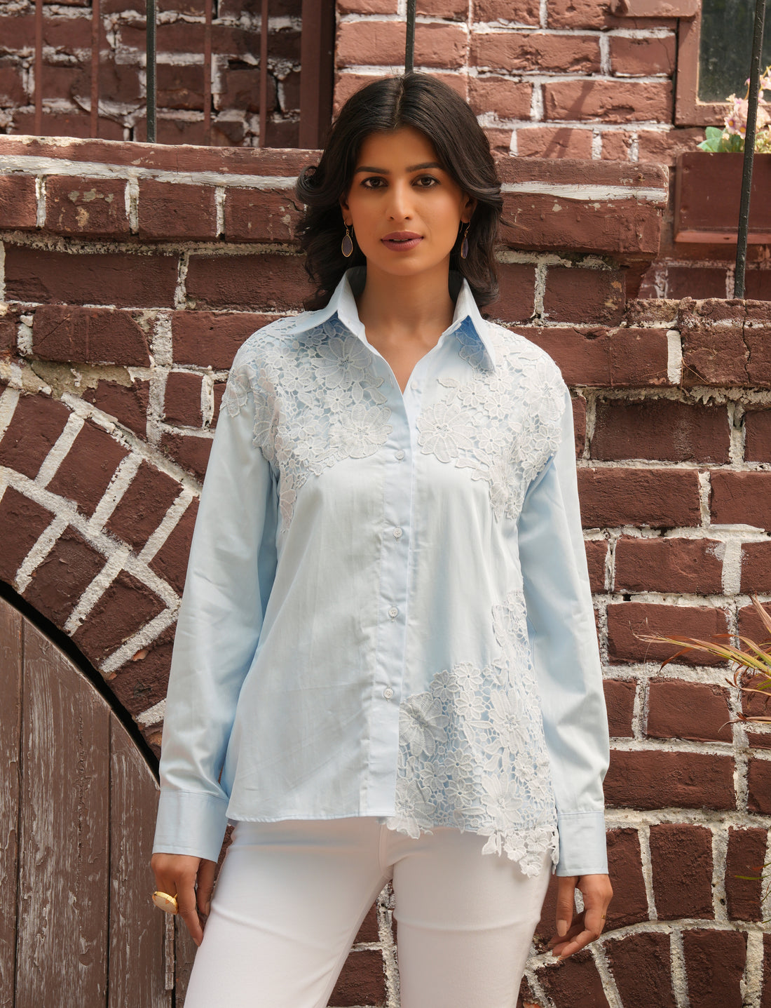 This shirt features a light pastel blue color in a long-sleeved, button-down silhouette. It stands...