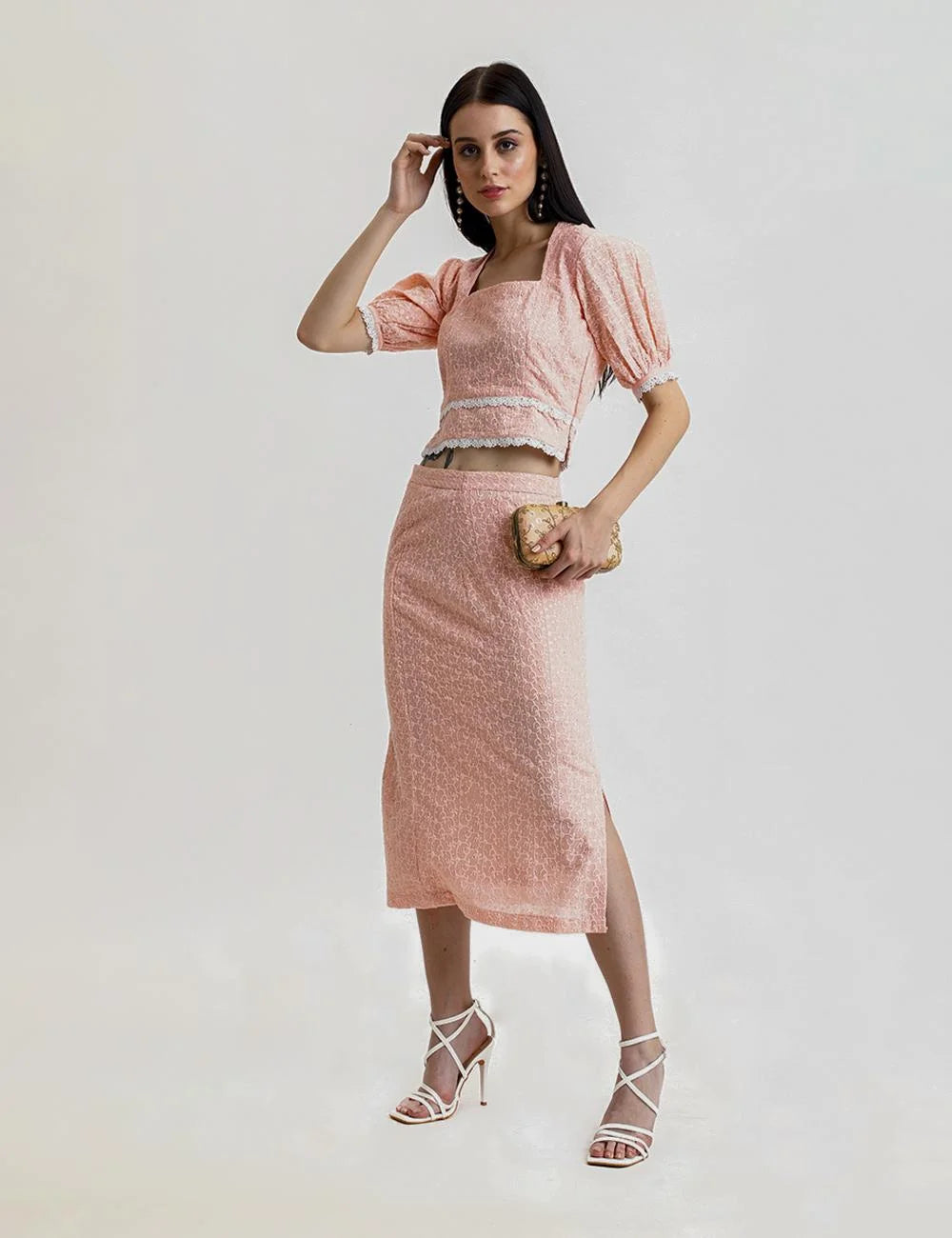 Embroidered fabric skirt & top co-ord has an elizabeth neckline, puff sleeves with laces and...