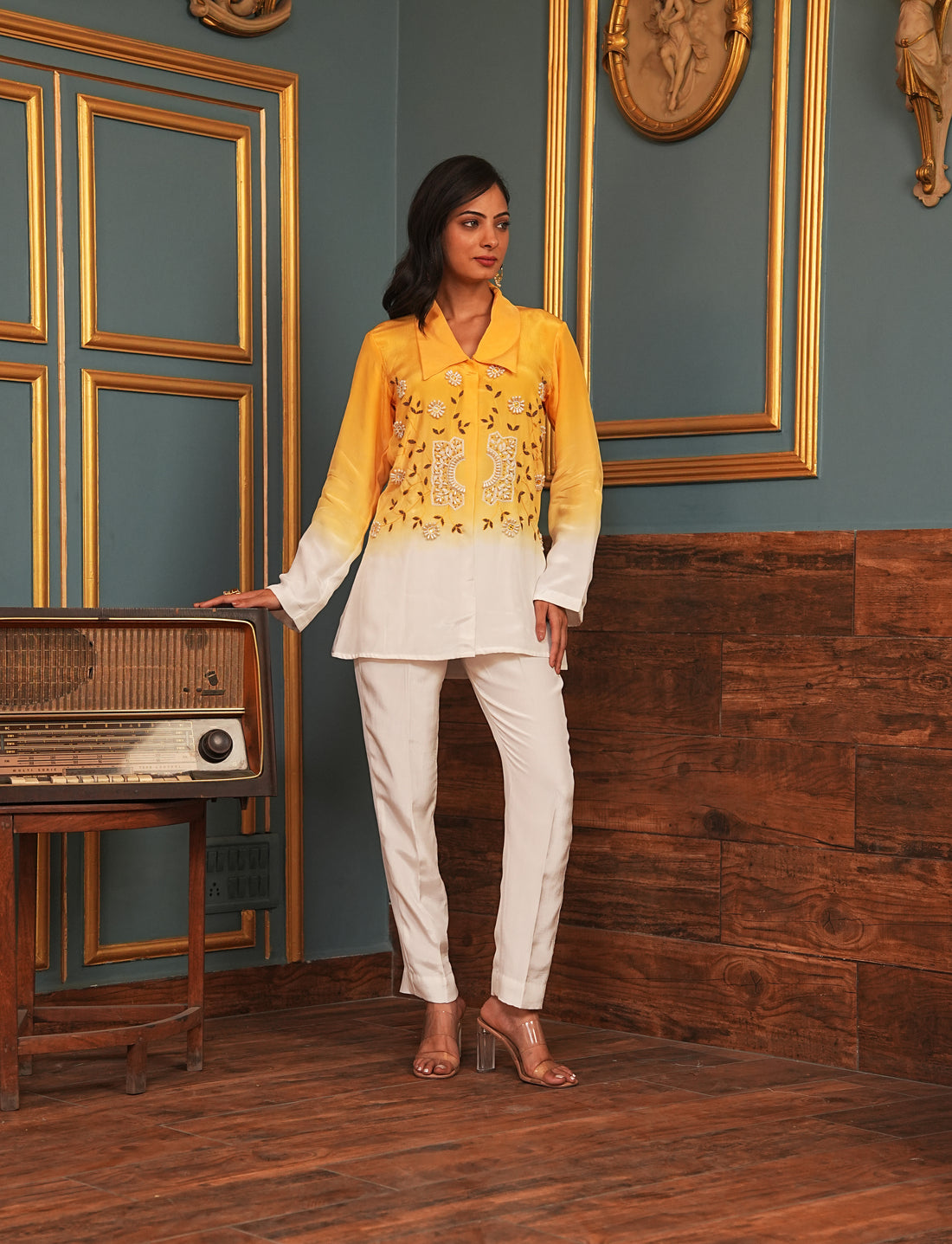 Ombre colour hand embroidery party wear co-ord set featuring a modern collar with placket, regular...