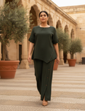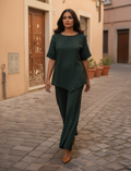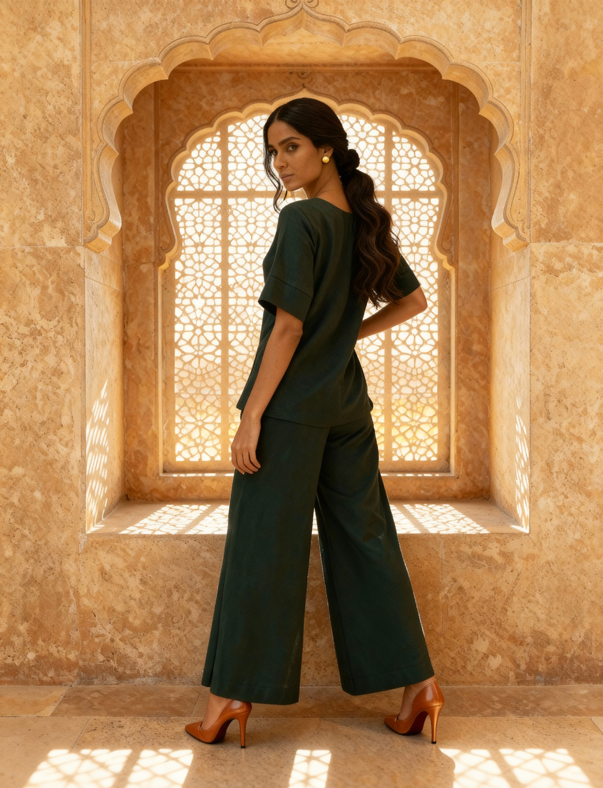 This co-ord set in pure linen fabric exudes effortless sophistication and comfort. the outfit features a relaxed-fit top with a unique asymmetric hemline and side button detailing, adding a contemporary edge to the minimalist design. paired with wide-leg pants that also carry matching button accents along the side slit, this ensemble combines structure with fluidity. perfect for casual chic outings or travel wear, this set embodies understated elegance with breathable luxury.