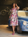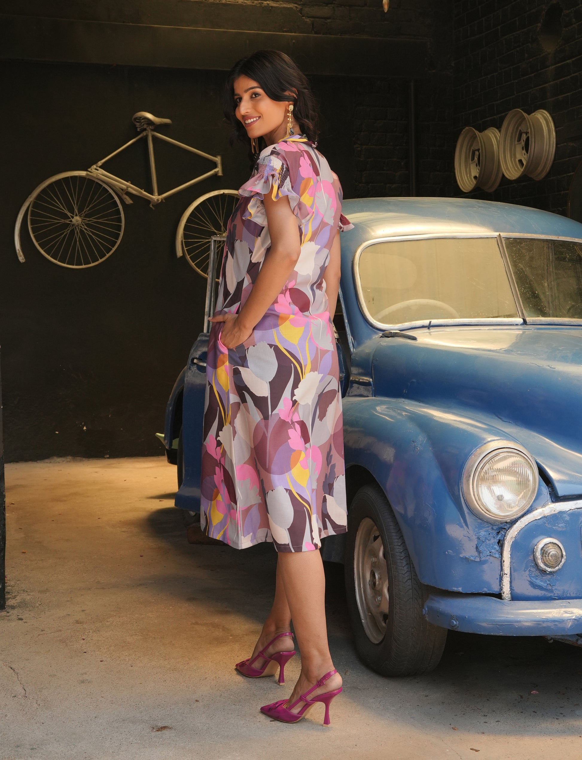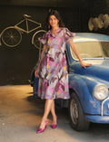 This is a fun and flowy multicolour a-line dress with a bright floral print that stands out beautifully. it has a stylish v-neckline and pretty smoking sleeves with ruffled ends that add a touch of playfulness. the front panel has tucks that give the dress a bit of structure while still keeping it comfortable and easy to wear. perfect for casual outings, brunch with friends, or a relaxing day out — just slip it on and you're good to go!