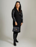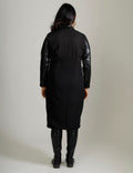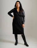 Slim fit black elegant dress has a leather shawl collar and leather full sleeves, darts for fittings.
