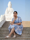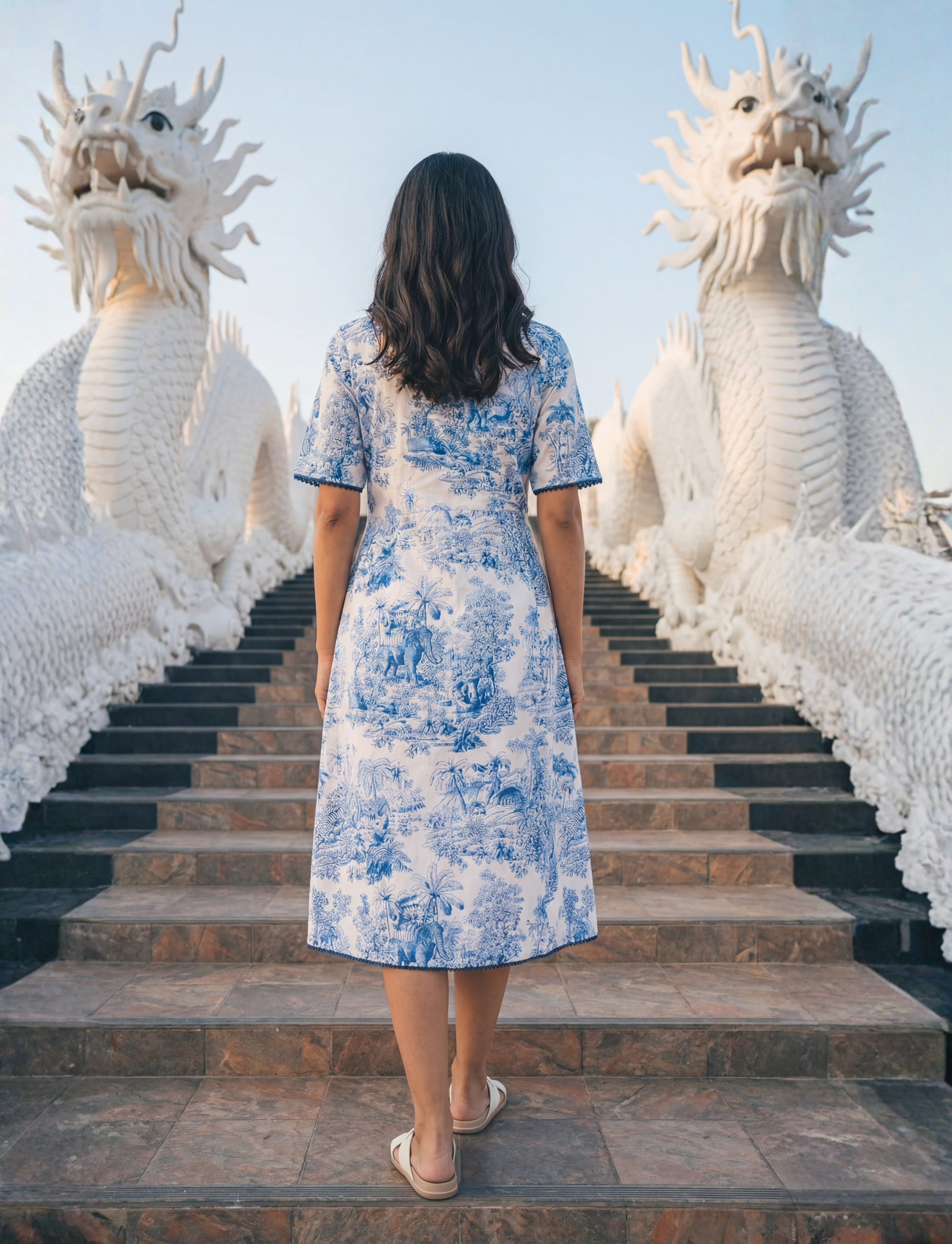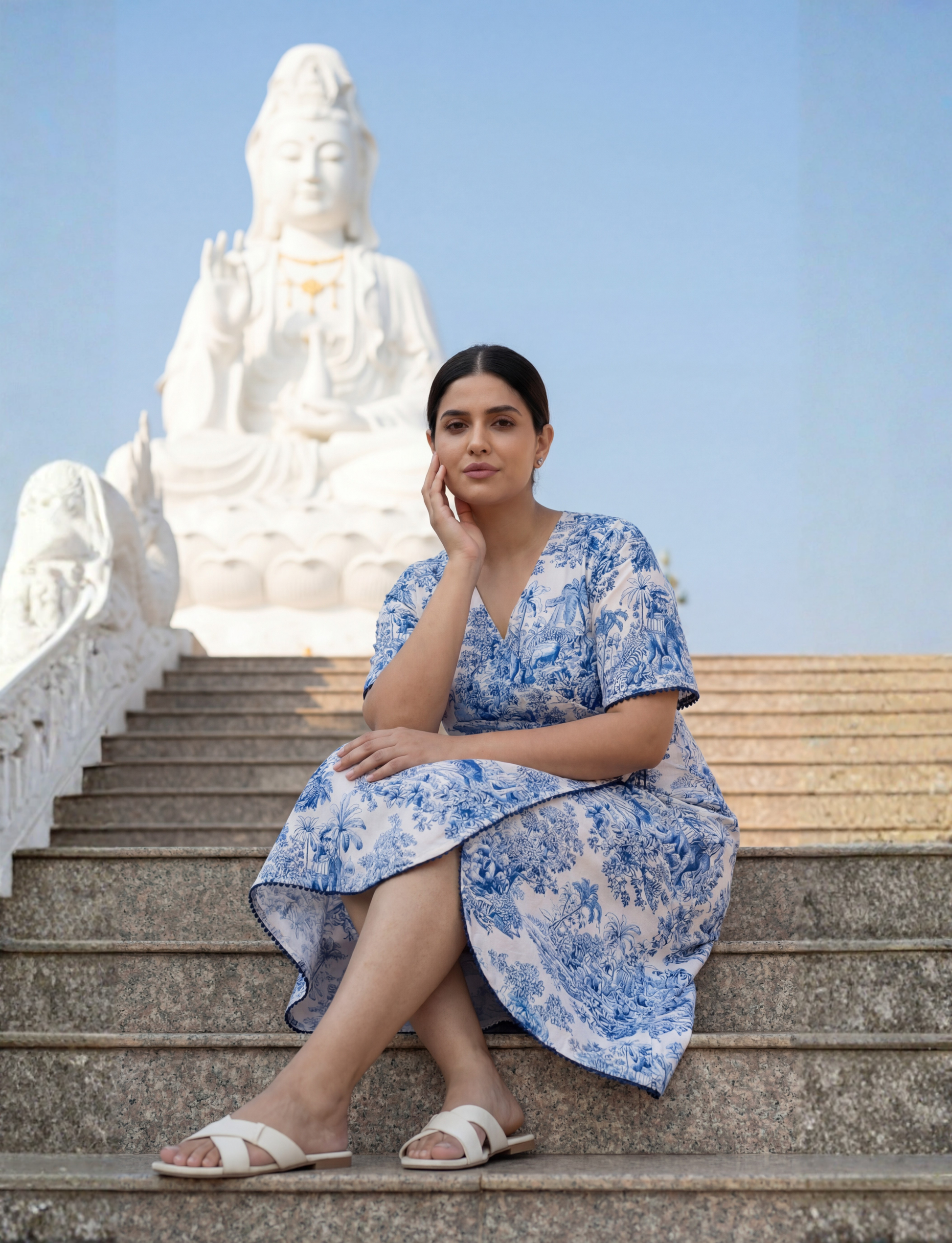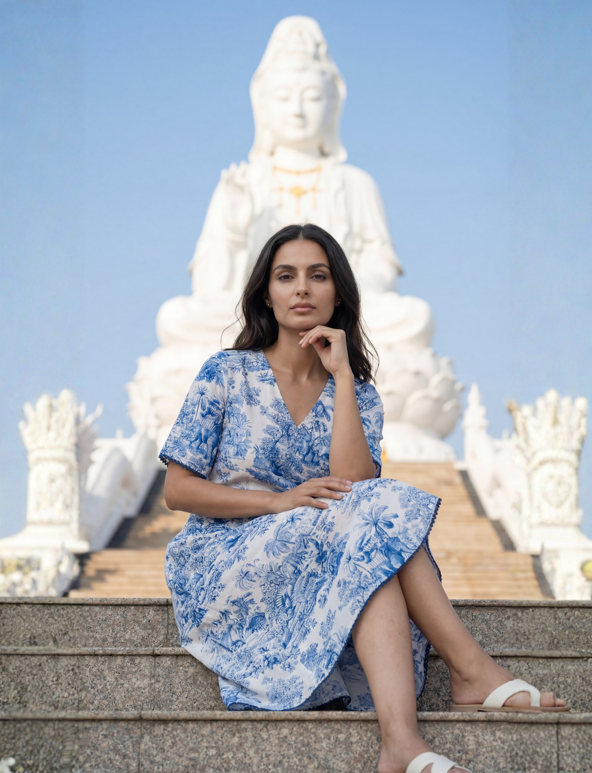 This classic blue and white printed day dress , giving it a refined, heritage feel. Designed with a wrap style v neckline , it sublty enhances the bust while offering a flattering fit. The short sleeves and easy a line silhouette provide comfort and movement. The knee length cut balances elegance and practicality, while the soft , flowy fabric ensures all day ease. Delicate contrast lace along the hem and sleeves add a neat, finished look. Prefect for day outings , brunches, vactions, or casual workwear .