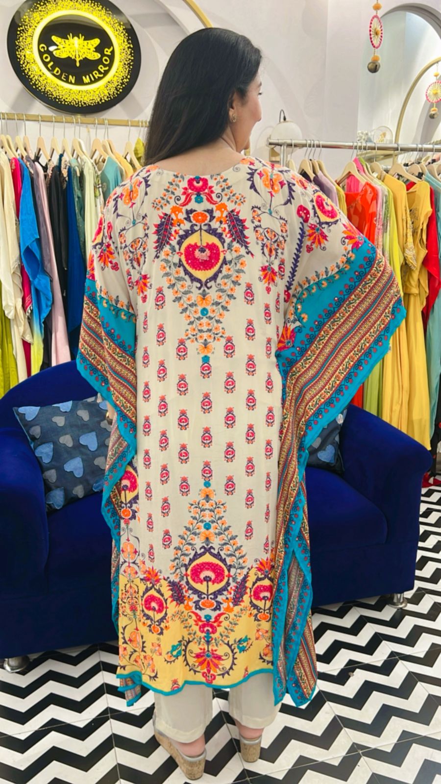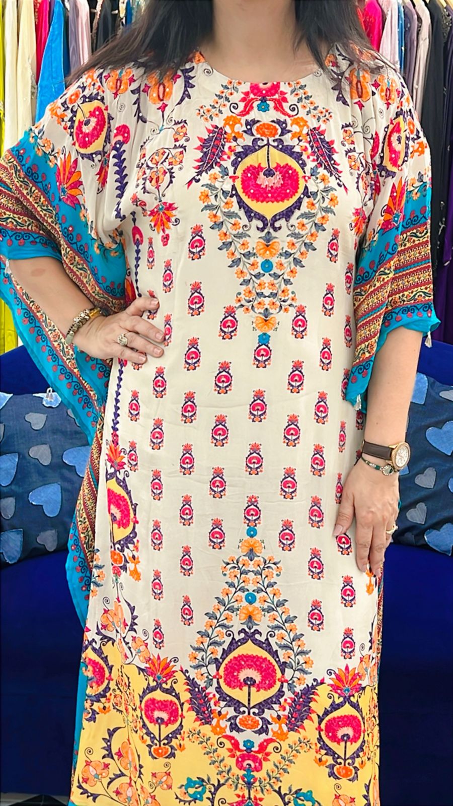 Step into effortless elegance with this pure crepe printed kaftan. Designed in a free-flowing silhouette, it features vibrant ethnic-inspired prints in striking hues of pink, orange, and blue against a soft cream base. The kaftan is accentuated with a colorful border and side detailing, adding a touch of sophistication and bohemian charm.– your go-to for chic comfort ✨💃
