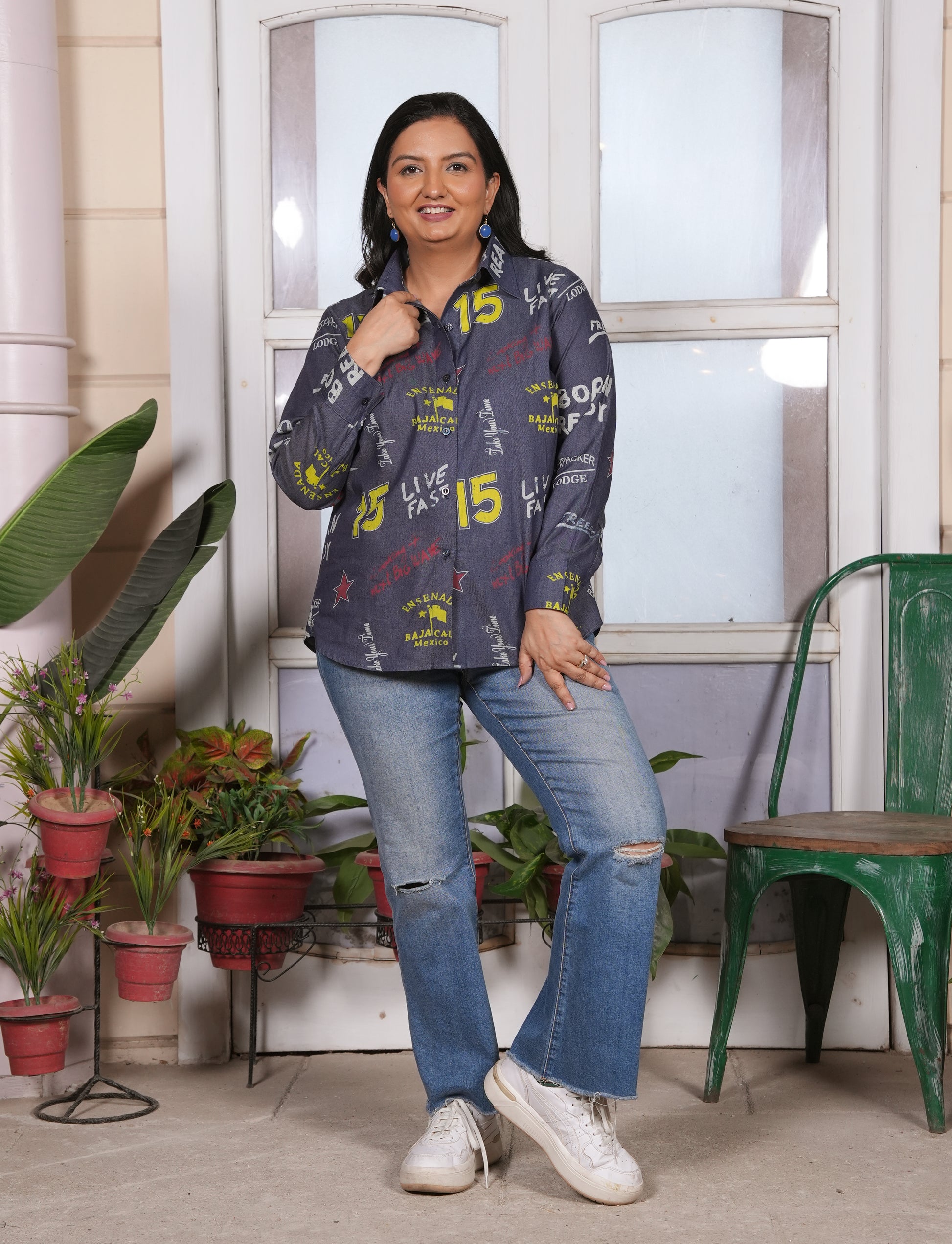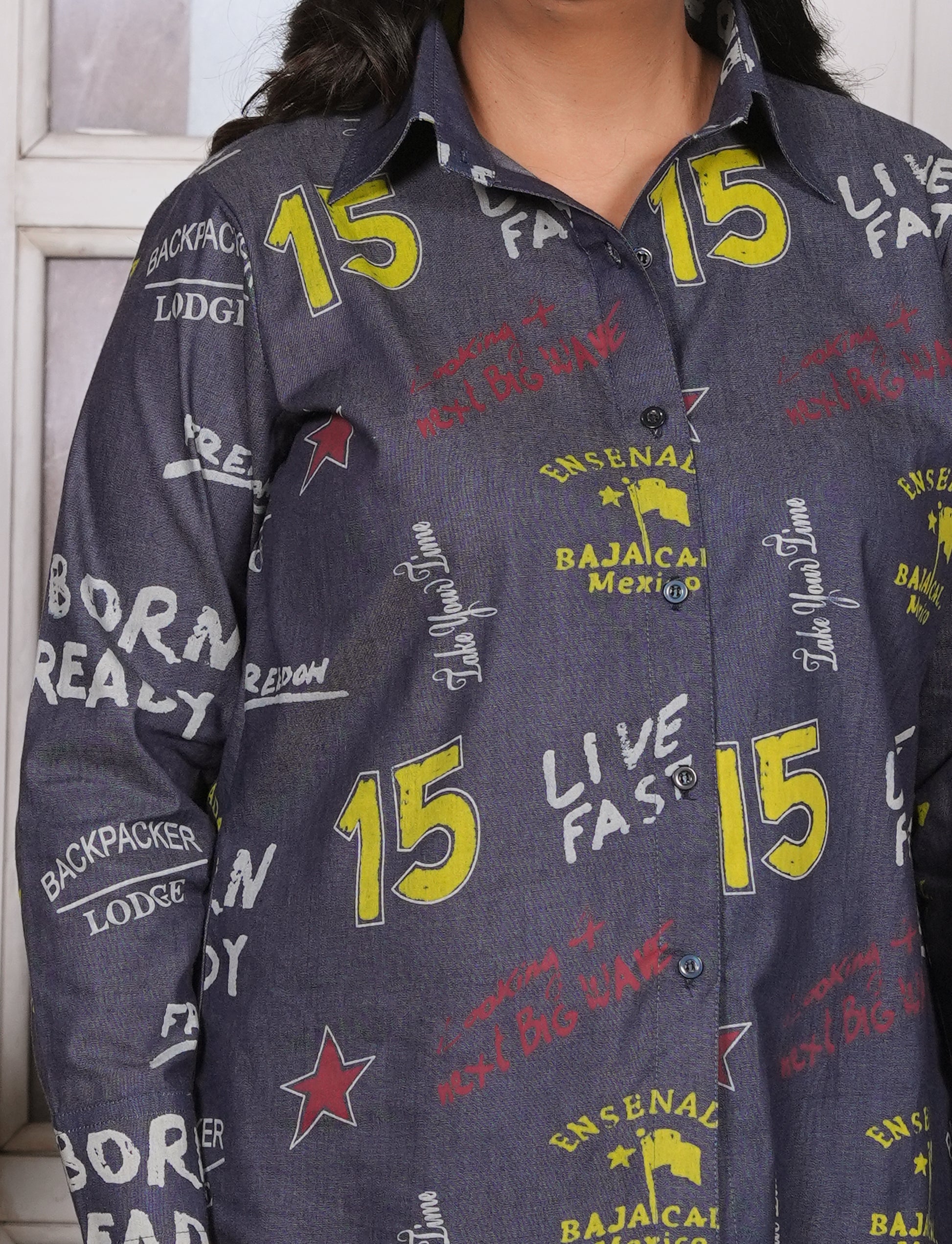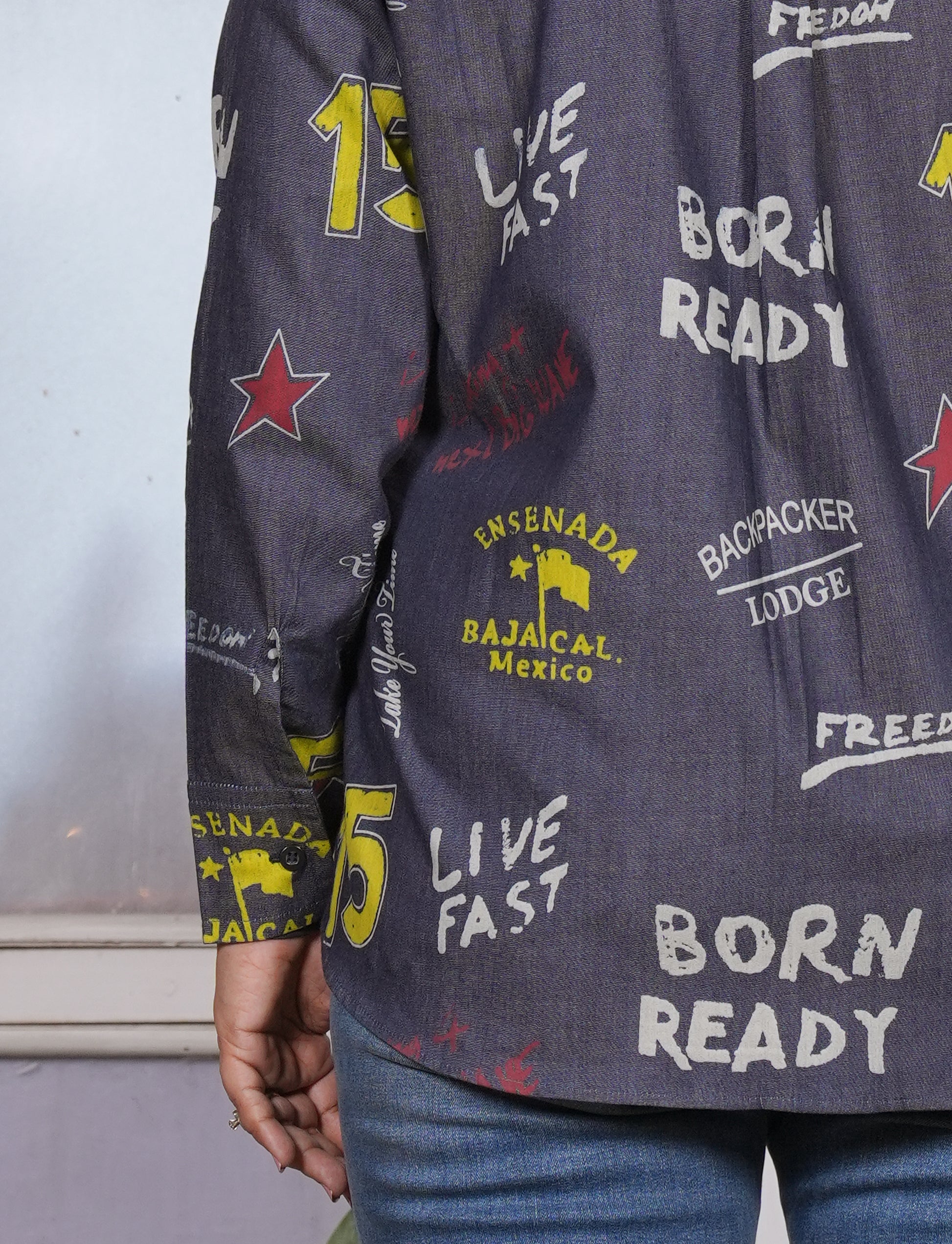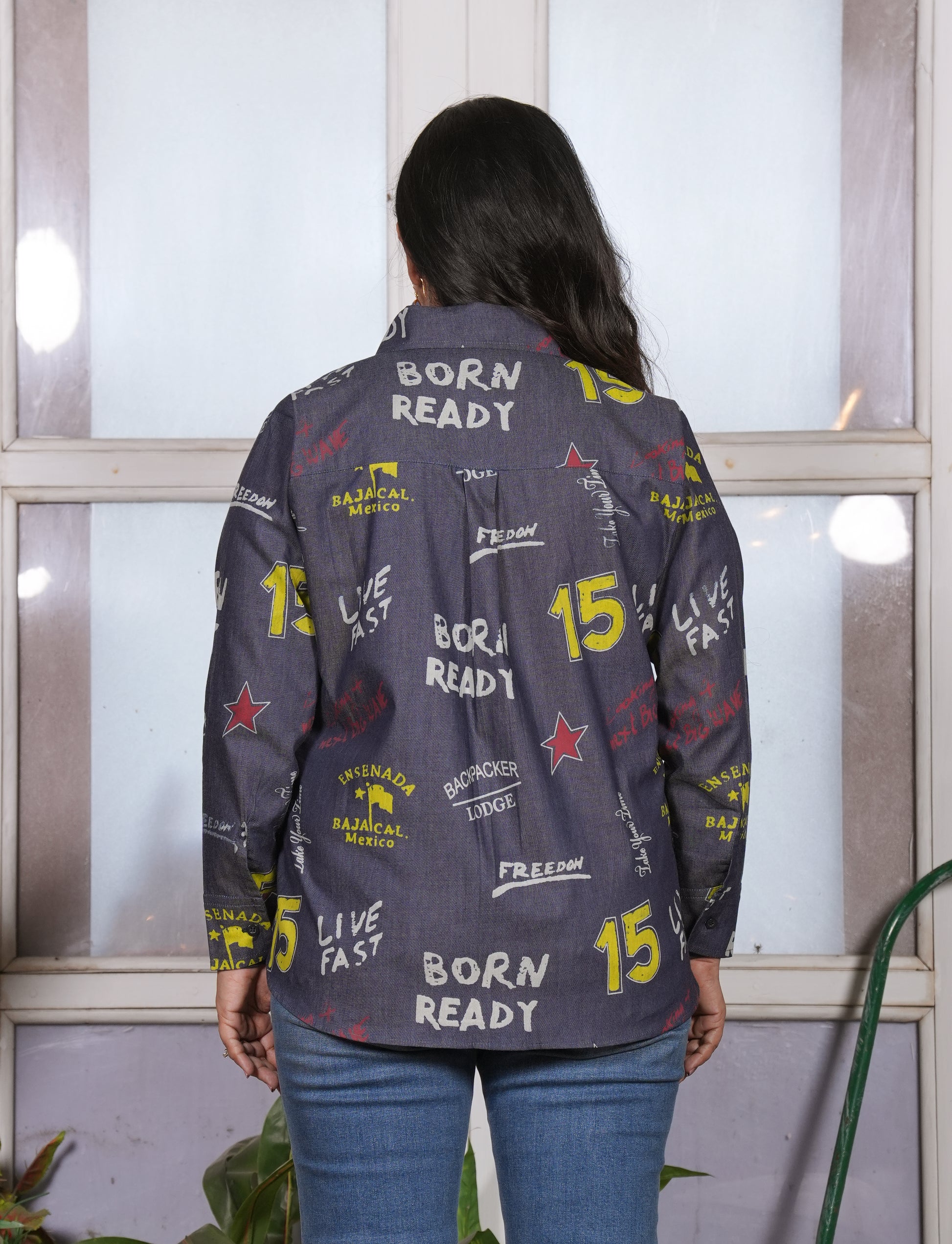 Make a bold statement in the born ready denim shirt. crafted from soft denim and covered in funky, eye-catching prints and numbers, this full sleeved shirt with classic cuffs adds a touch of rebellious charm to your everyday wardrobe. whether you're out exploring the city or chilling with friends, this shirt delivers effortless cool and street style vibes.