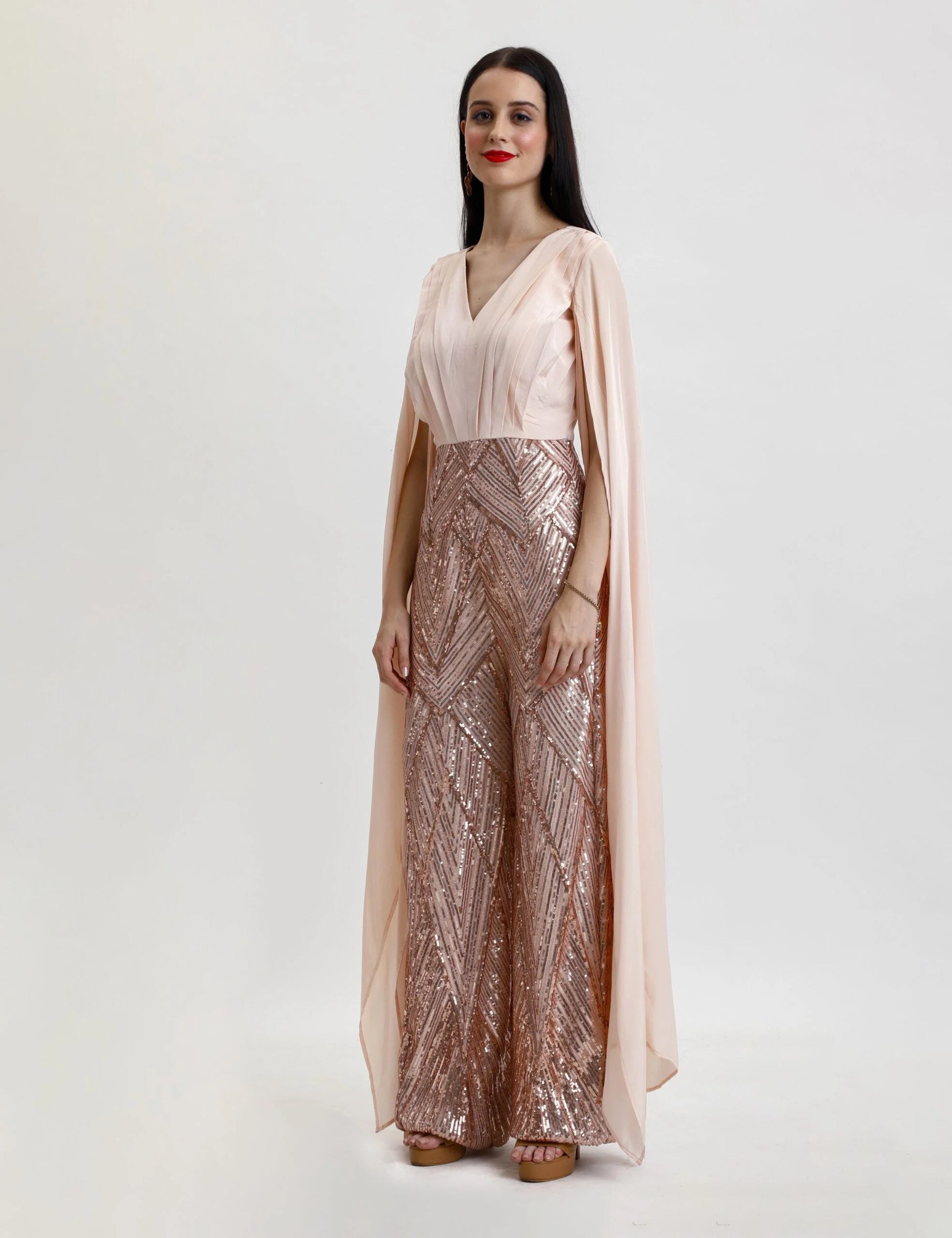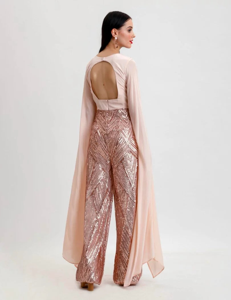 Party Wear Jumpsuit Comes With Cape Sleeves, Pleated Yoke And V Neckline And Back Key Hole, Attached With Embroidered Bell Bottoms, Back Zip Closure.