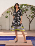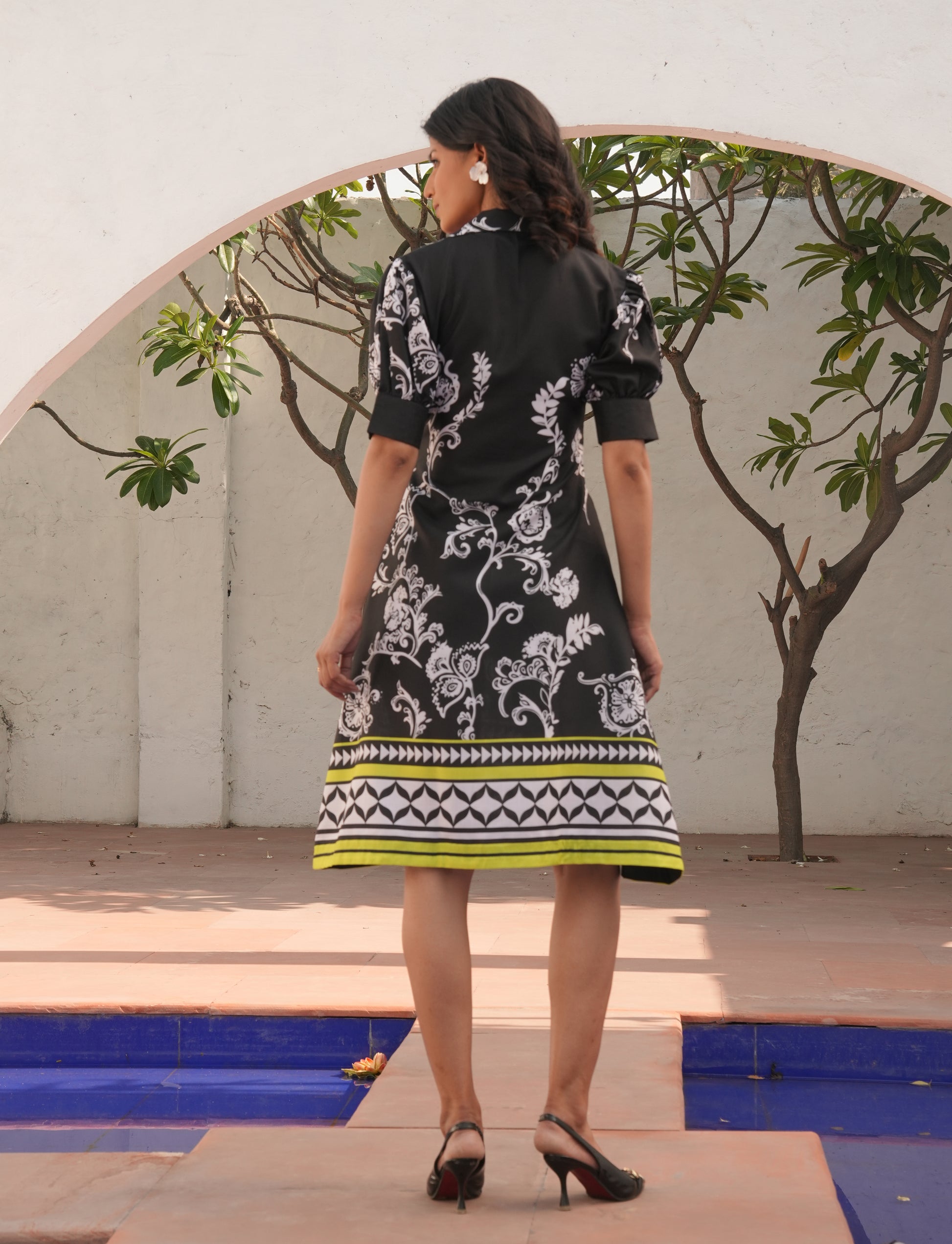 A chic black a-line dress featuring a shirt collar with a flattering v-neckline, perfectly blending smart and casual styles. the puff sleeves with structured cuffs add a touch of femininity and elegance. designed with a relaxed a-line silhouette for effortless comfort, this dress also includes unseen side pockets for practicality without compromising style. eye-catching botanical motifs and a geometric border at the hemline with a pop of neon lime make it a modern statement piece for everyday casuals or brunch outings.