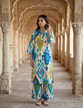 This kurta set features a vibrant ikkat-inspired abstract print on a soft off-white BASE with shades of turquoise, lime green, and subtle coral accents. The kurta comes in a straight, relaxed silhouette highlighted by a continuous v-neckline, giving it a clean and elongated look. It is paired with three-quarter flared sleeves for a modern touch and coordinated printed straight flared pants, creating a well-balanced and stylish ensemble. Perfect for effortless daywear with a contemporary ethnic vibe.