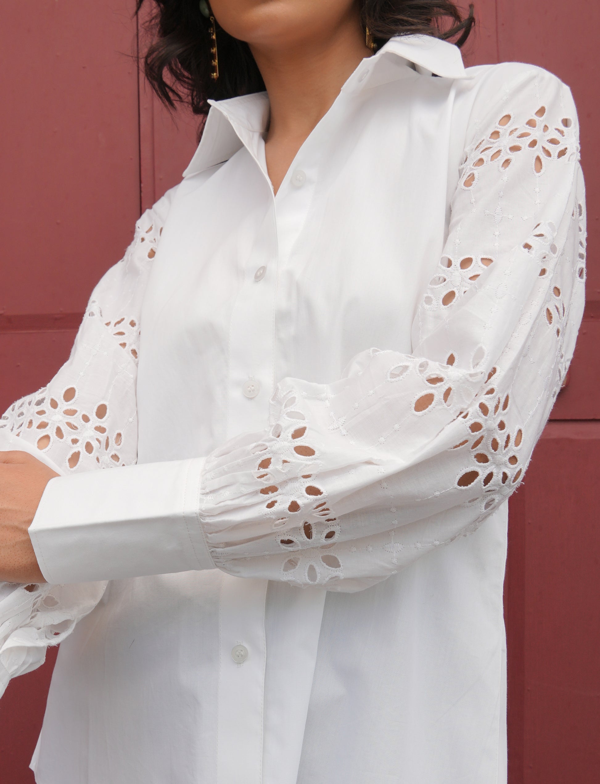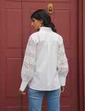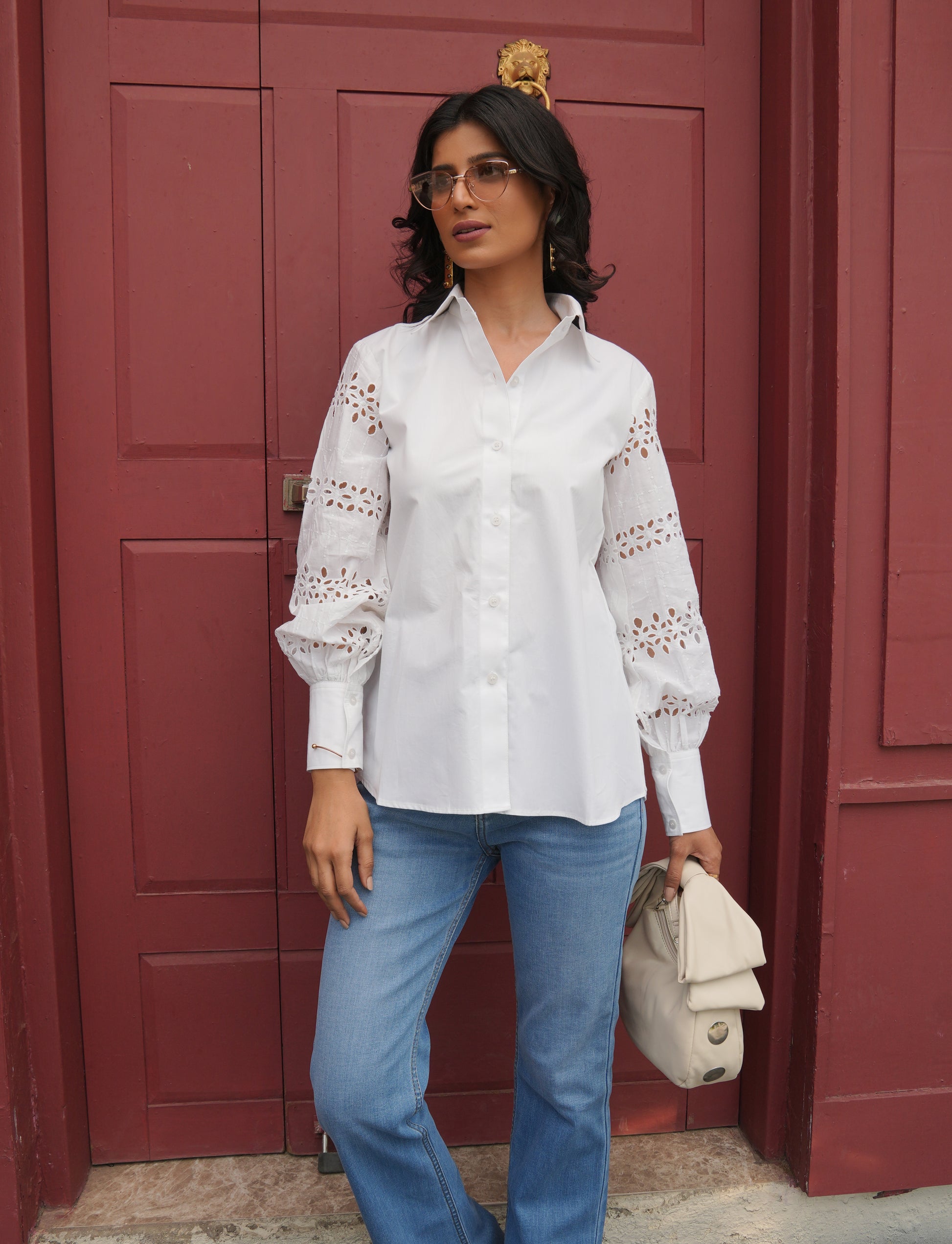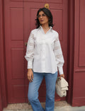 Elevate your everyday style with the ellora shirt, a timeless piece blending classic tailoring with intricate craftsmanship. made from premium white cotton poplin for a crisp, structured look, this shirt features full-length puff sleeves crafted in delicate hakoba fabric, offering a subtle play of texture and transparency. the shirt collar adds a polished edge, while the cuffed sleeves provide a tailored finish.