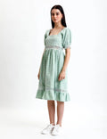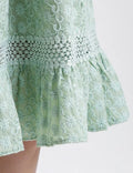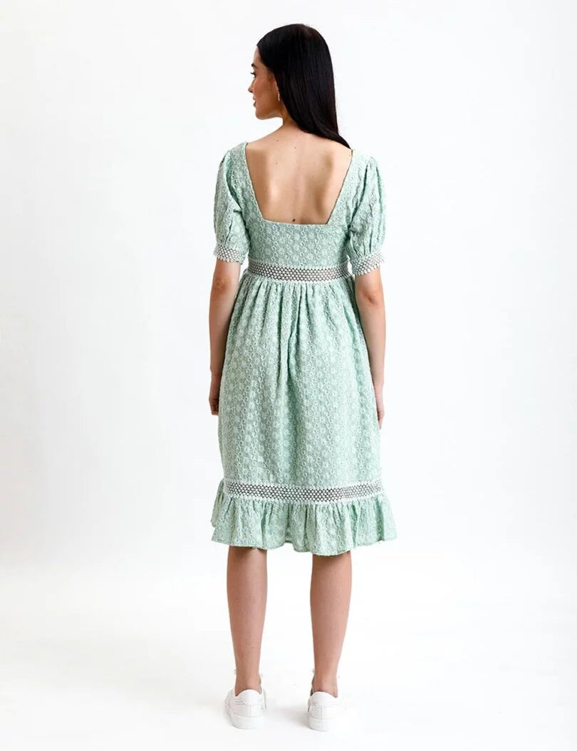 Embroidered Dress has a Square Neckline, Short Puff Sleeves , Dress Embellished With Lace, Ruffle Hem, Side Zip Closure.