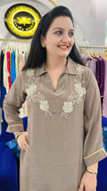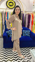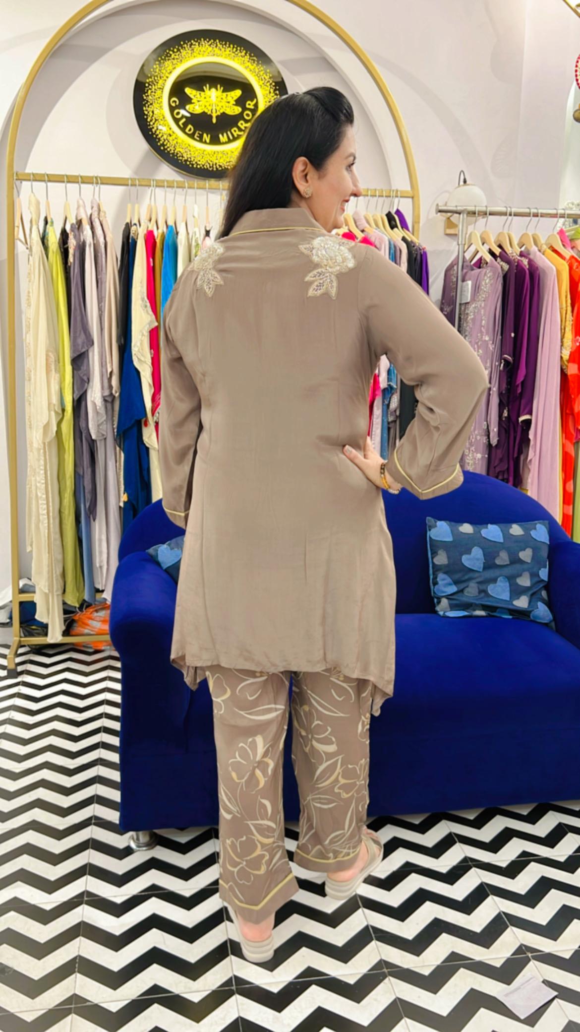 This Co-ord set is made from smooth crepe fabric, offering a lightweight and flowy drape. The top features a straight, relaxed silhouette with a shirt collar with V-neckline and subtle floral embroidery in soft ivory tones across the chest and back side on shoulder. Its sleeves are long with minimal yellow piping on the cuffs, adding a refined touch. The matching trousers are adorned with an all-over floral outline print in light gold, complementing the embroidery on the top. The set pairs elegance with comfort, perfect for casual gatherings or semi-formal wear. 🤍