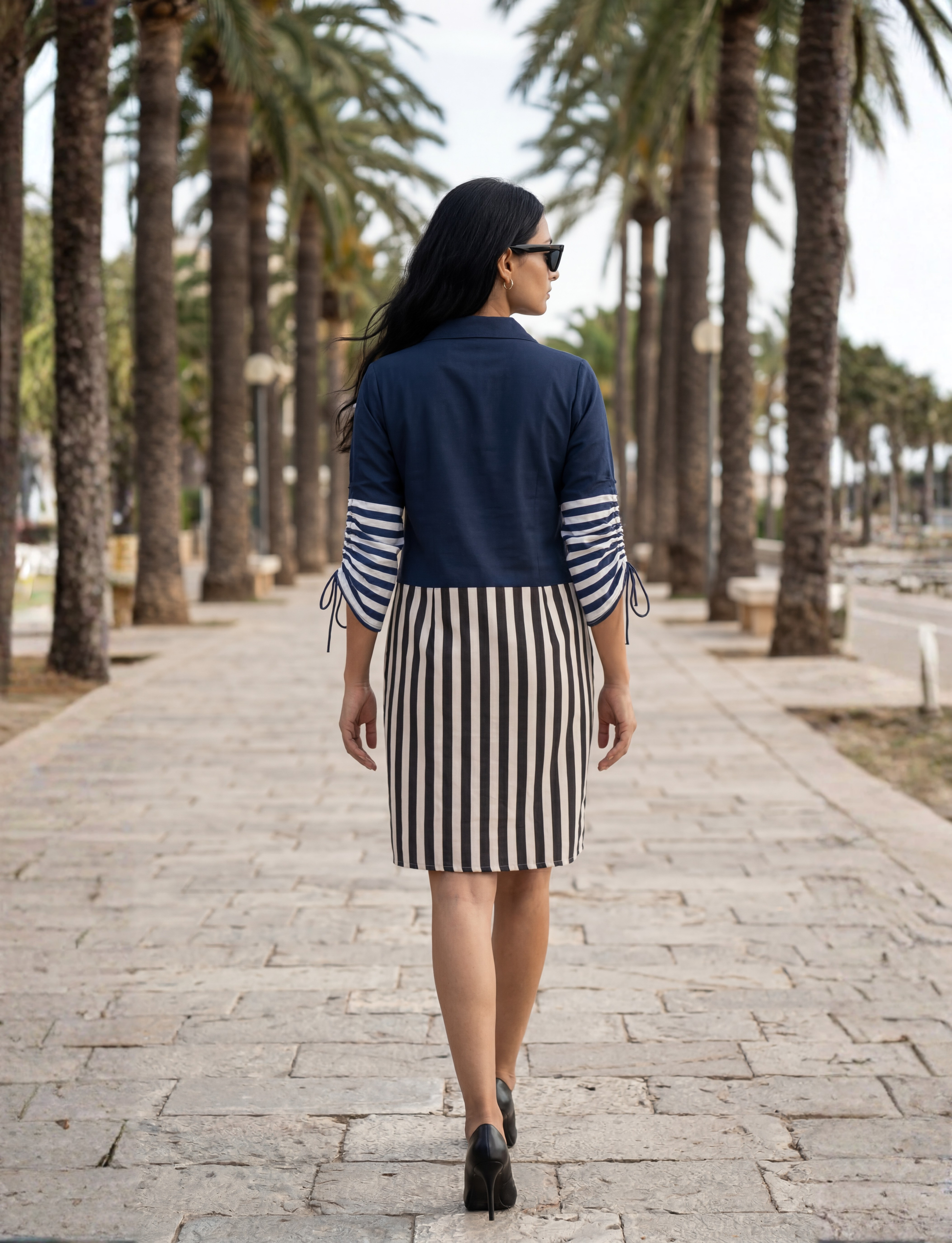 A modern color - block shift dress featuring a blue cotton upper with a zip front shirt collar , paired with a black and white vertical panel. The design is highlighted with a golden palm tree motif embroidery on the front and three quarter sleeves with striped drawstring, sleeves detailing , creating a bold and contemporary statement look.