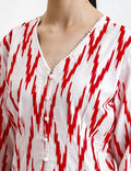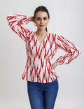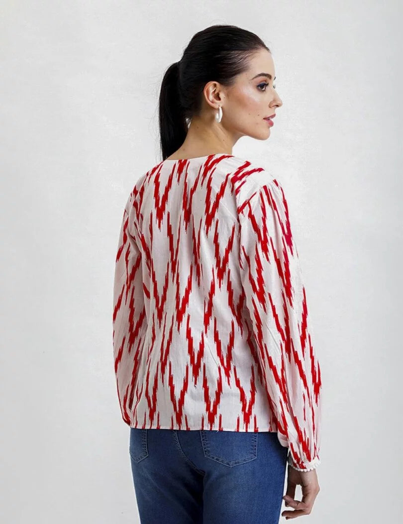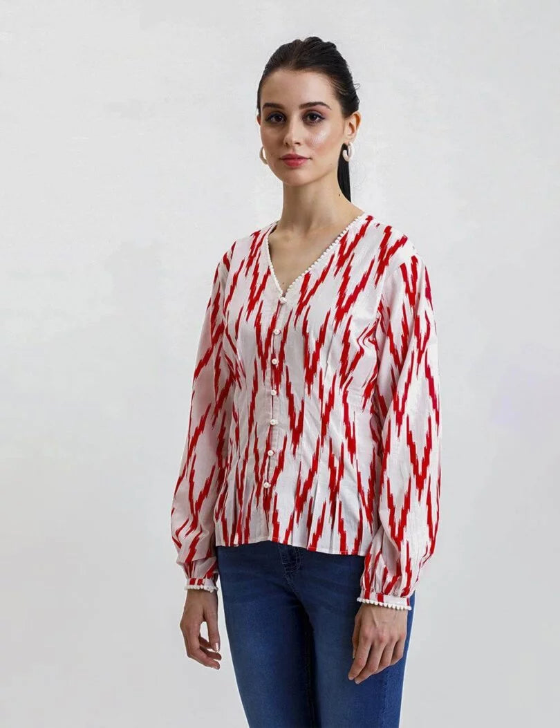 Ikkat Printed Button Down-shirt With V Neck, Long Puff Sleeves, Front Tucks, Embellished With Lace On Neck And Sleeves.