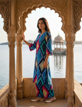 A striking kurta set featuring an eye-catching ikkat-inspired geometric print in shades of cobalt blue, teal, magenta, mustard, and ivory. The straight-cut kurta is designed with a relaxed silhouette, a flattering v-neckline, and three-quarter sleeves, offering both comfort and elegance. Paired with coordinated bottoms in the same dynamic pattern, this ensemble creates a cohesive and statement-making look. Perfect for casual gatherings, festive occasions, or daytime events, this kurta set blends traditional motifs with a modern aesthetic for a bold yet effortless style.