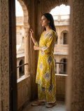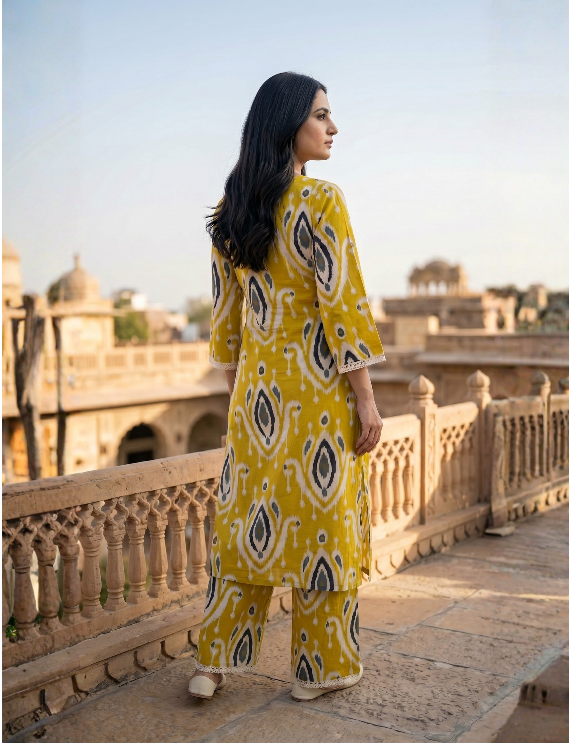 A vibrant and contemporary kurta set crafted in breathable cotton fabric, featuring a striking mustard yellow BASE adorned with bold ikkat-inspired motifs in white and deep blue tones. The straight-cut kurta is designed with a flattering v-neckline highlighted by delicate lace detailing, adding a soft feminine touch. Three-quarter sleeves with lace-trimmed hems enhance its elegance. Paired with coordinated straight flared pants showcasing the same eye-catching print and subtle lace accents at the hem, this set offers a balanced blend of comfort and style. Perfect for casual outings, day events, or effortless everyday wear.