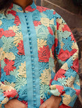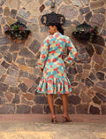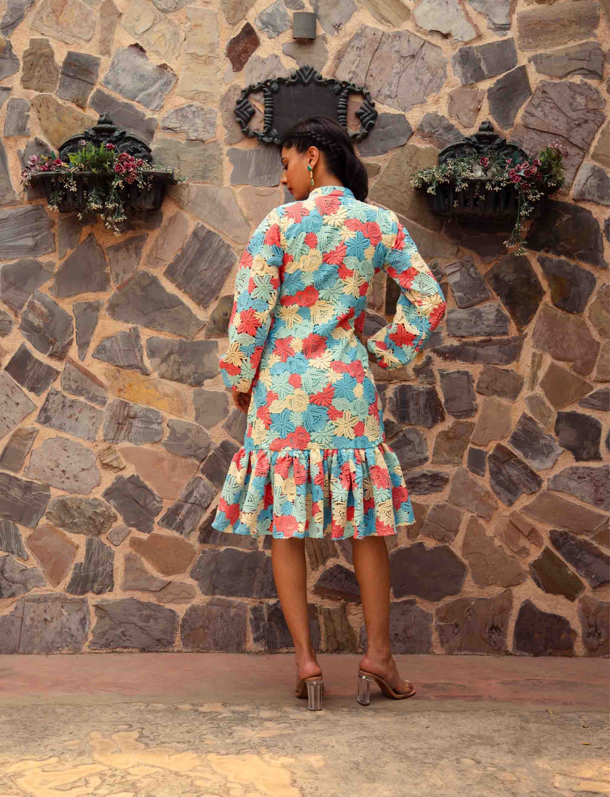 Description: Multicolour Shiffli dress features a mandarin collar, puff sleeves with elastic end, drop waist with front placket potli buttons, and flounced gathered hemline.