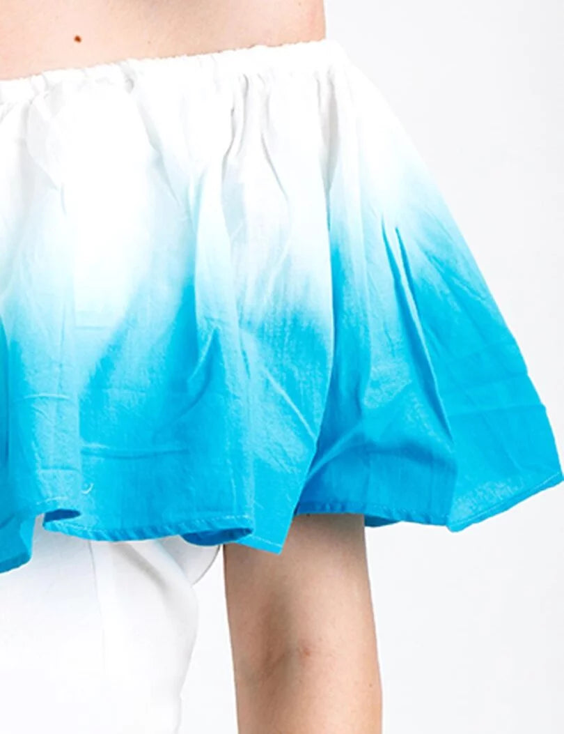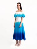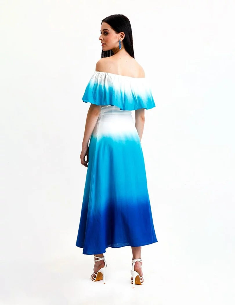 Stylish Off Shoulder Ruffle Dress Featuring A Gorgeous Blue Ombre Pattern, A Ruffled Hem And Fitted Top. Side Zip Closure.