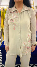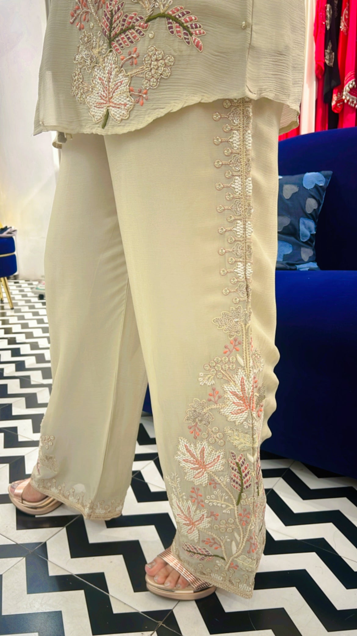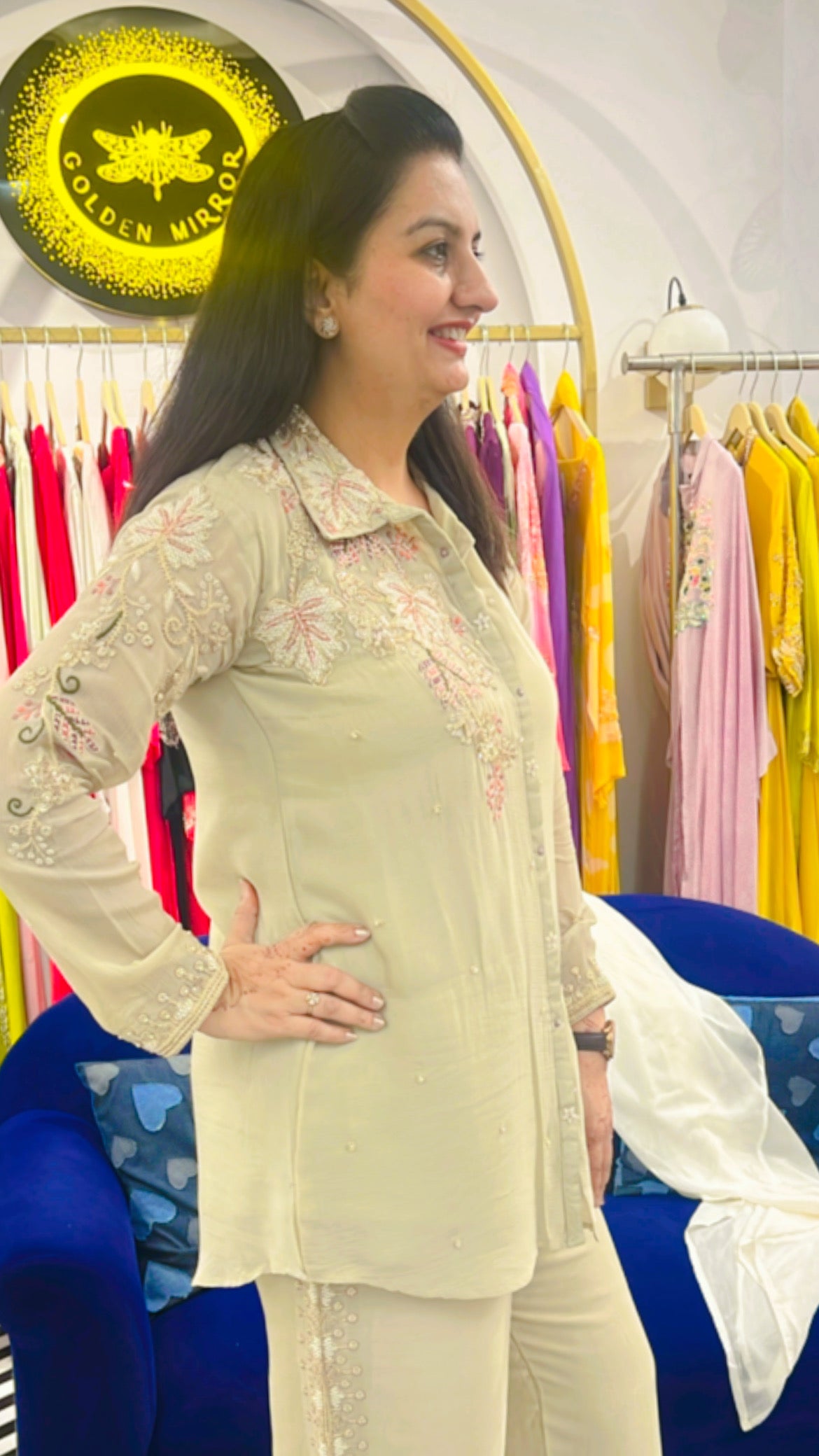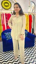 Step into elegance with this exquisite co-ord set, crafted from premium pure Chinon fabric—renowned for its soft drape, luxurious sheen, and breathable comfort. Adorned with meticulous hand embroidery, this set features the iconic Chinar Patti leaf and delicate floral motifs, adding a touch of timeless, Kashmiri-inspired artistry.