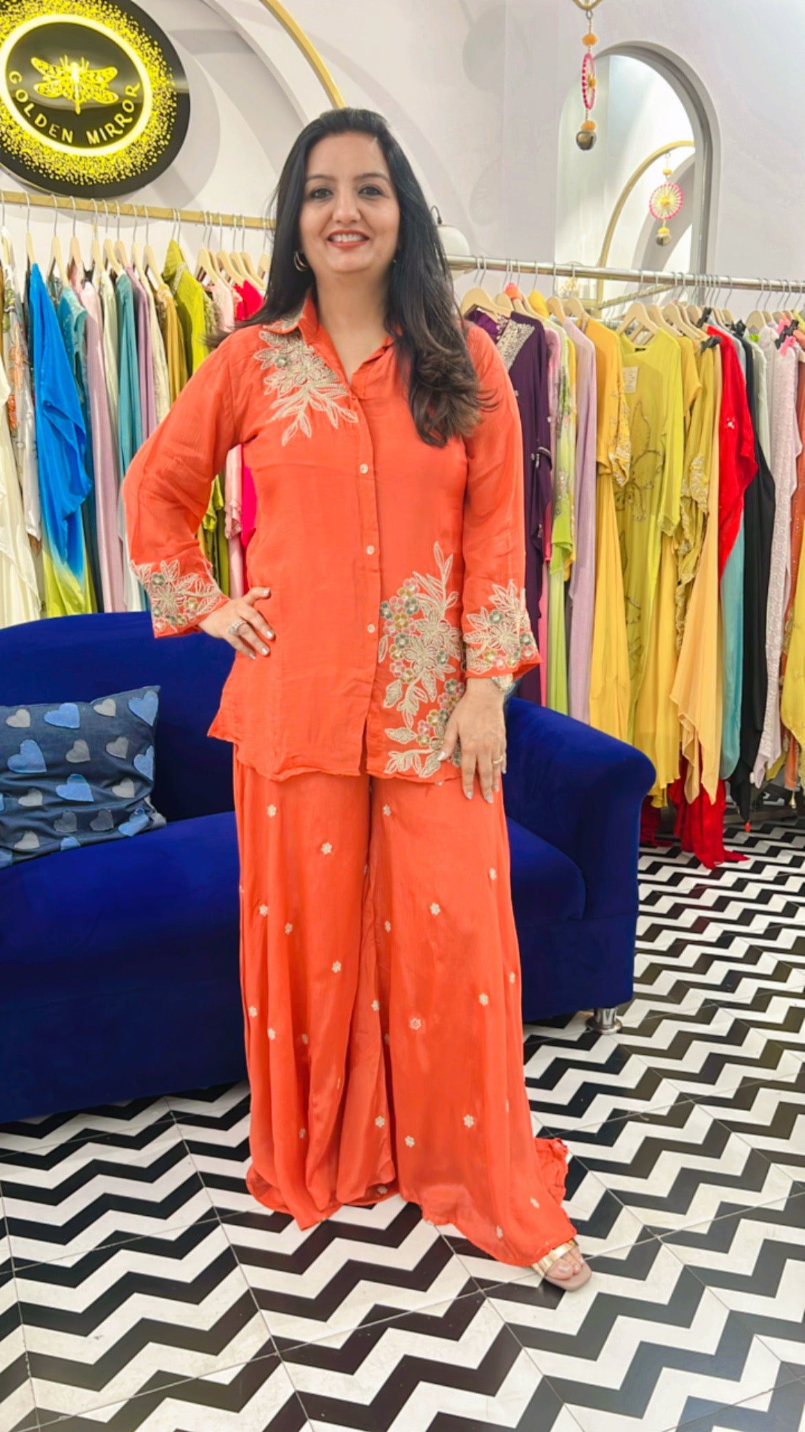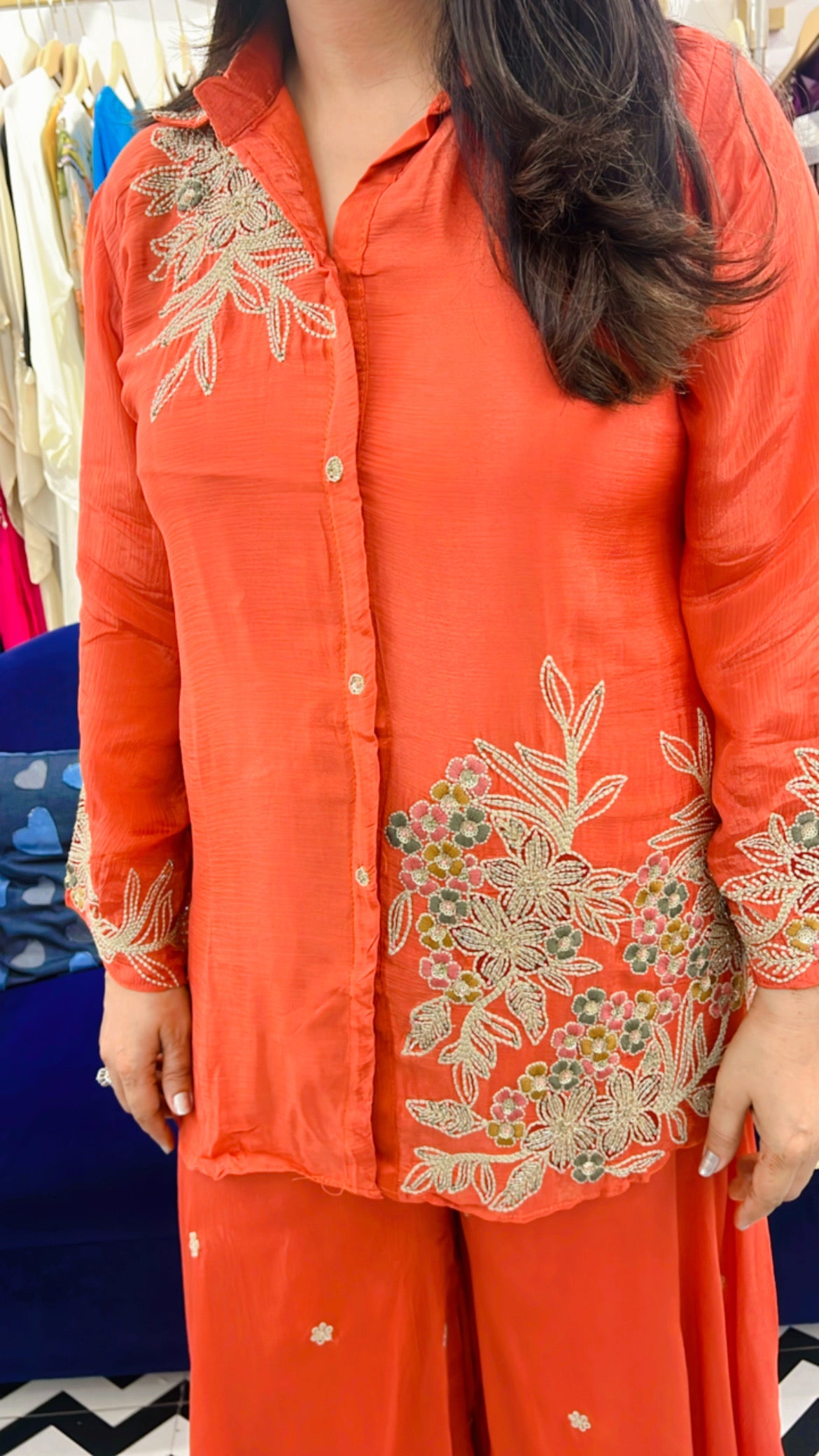 Radiate warmth and vibrance in this stunning orange plazo set crafted from pure Chinon fabric. The shirt features delicate handwork that adds a touch of traditional elegance, while the plazo is adorned with small floral motifs scattered gracefully all over—creating a beautiful interplay of texture and detail.