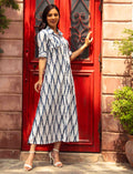 Ikkat shirt dress has a shirt collar, 3/4th cuff style rolled-up sleeves, chest patch pockets, and front buttons.