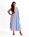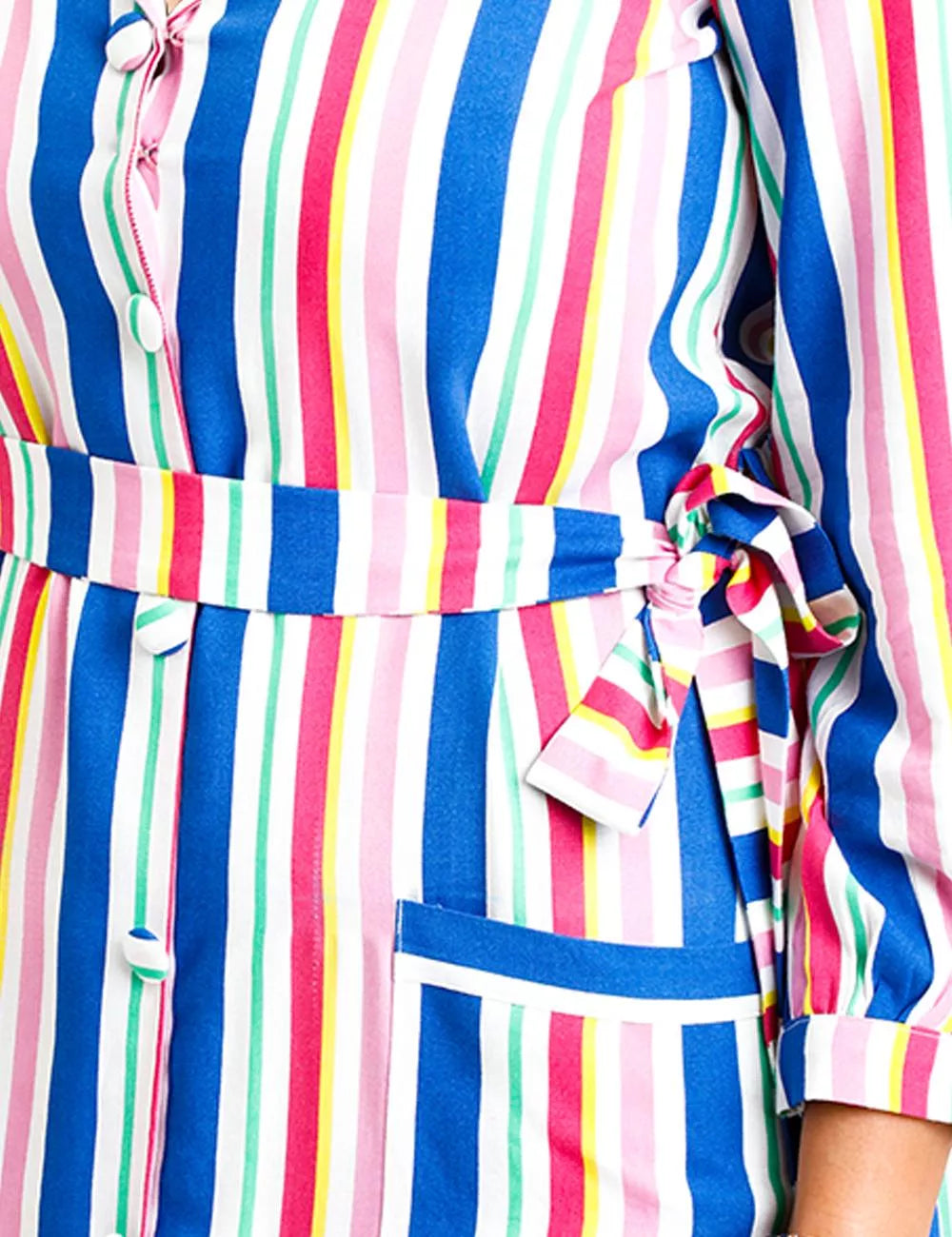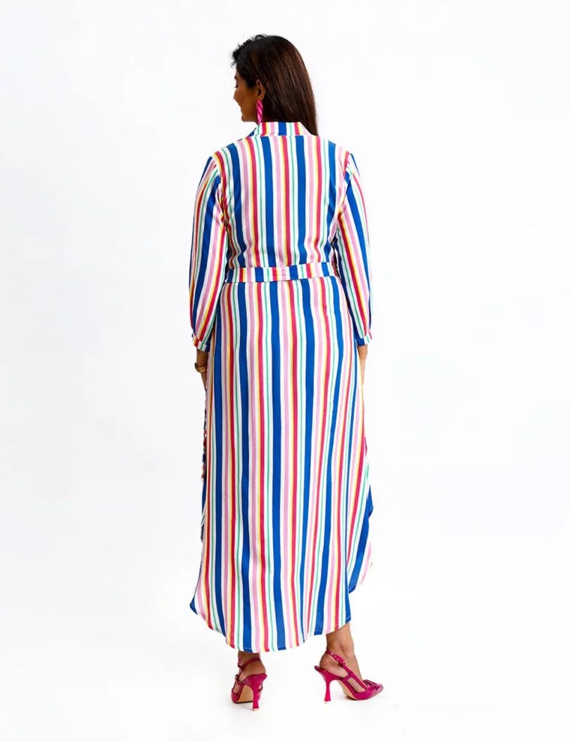 Colourful vertical stripe shirt dress has a notched collar, button down, regular sleeves with single button cuff attached with front pockets and belt.