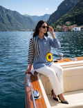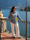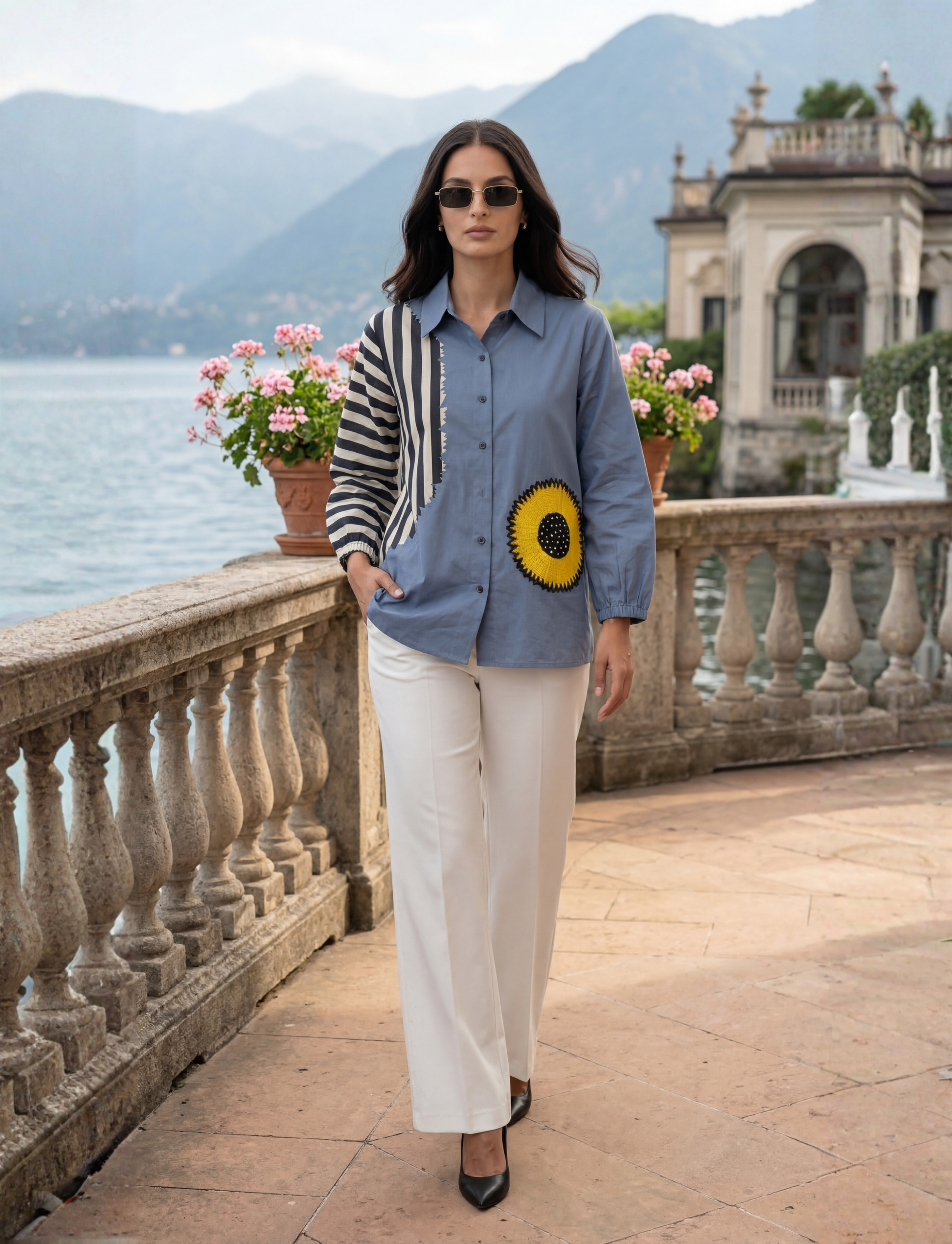 Iced blue shirt with black and white striped combo , the shirt has a classic collar neckline with a front button - down placket, giving it a relaxed yet polished look. One sleeves stands out bold black and white horizontal stripes, adding a striking contrast to the minimal base. The highlight of the design is the large sunflower motif placed on the lower front . Paired with denim jeans , the outfit creates a clean and balanced look, perfect for casual chic or smart- casual styling