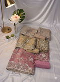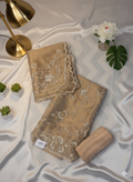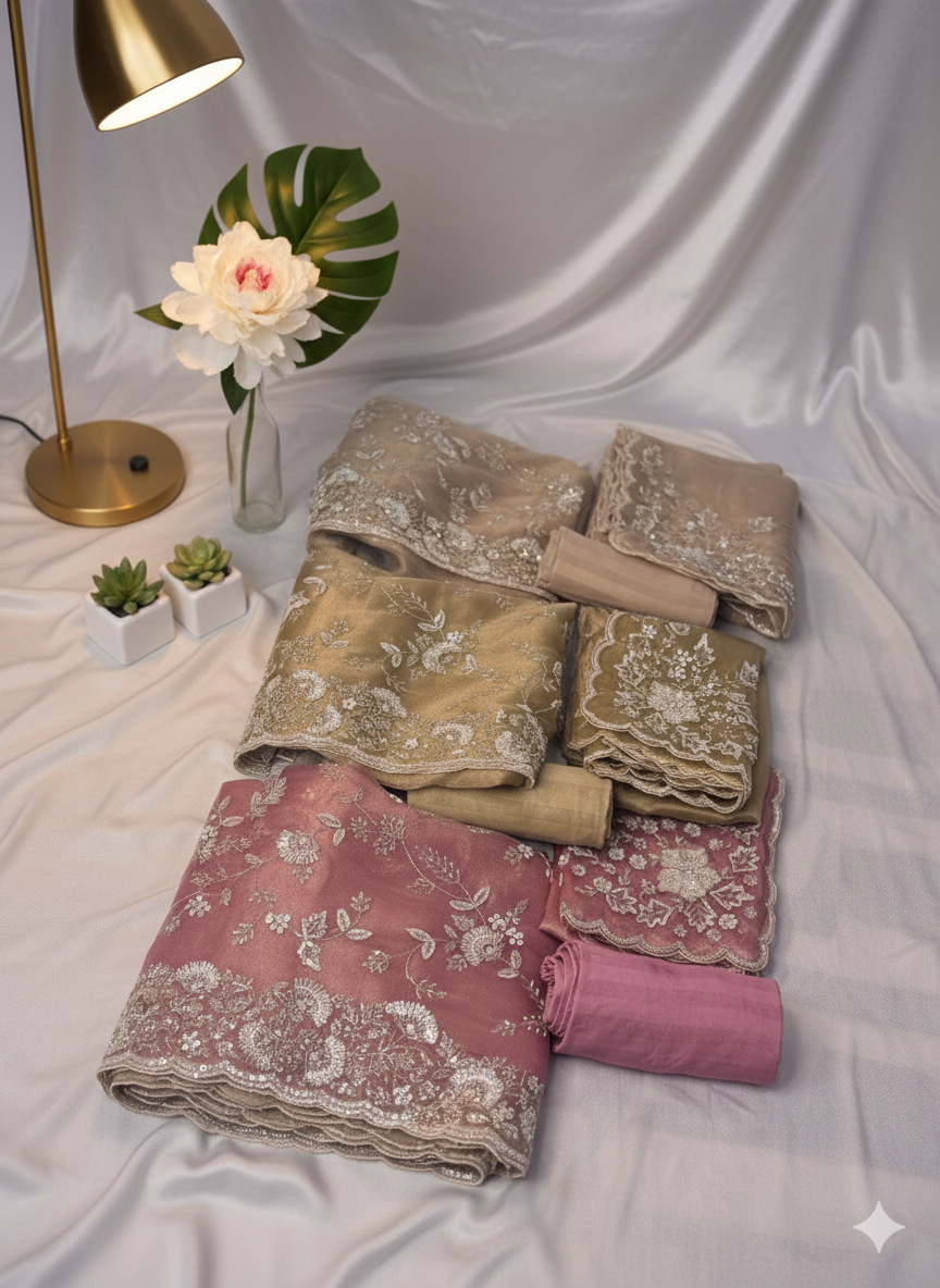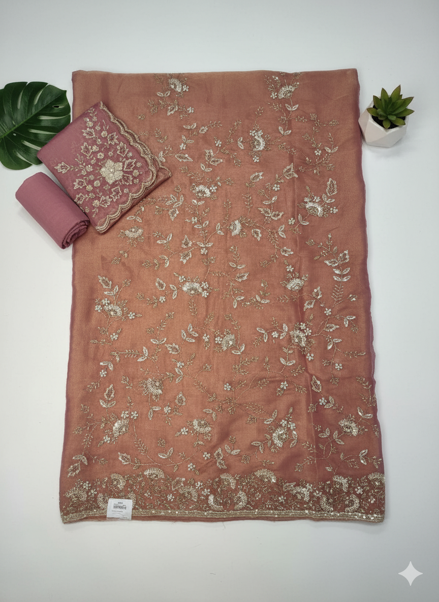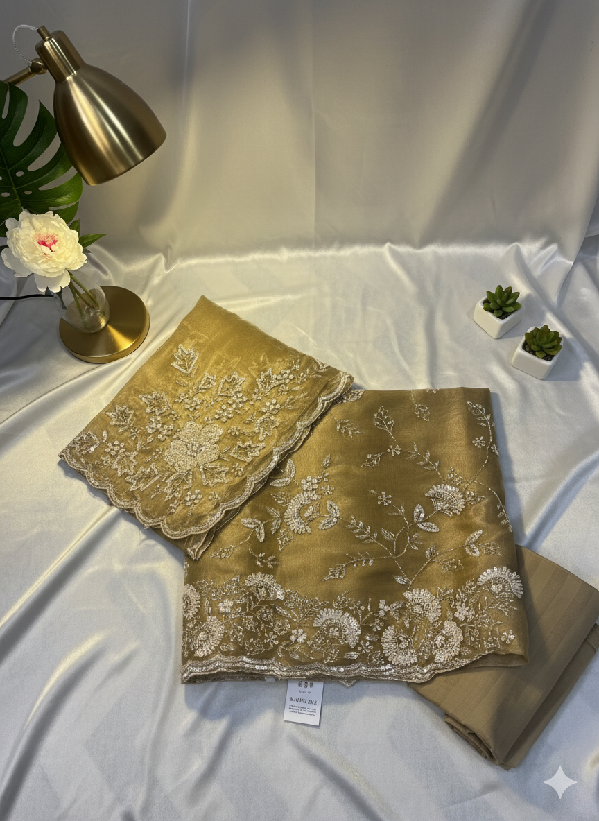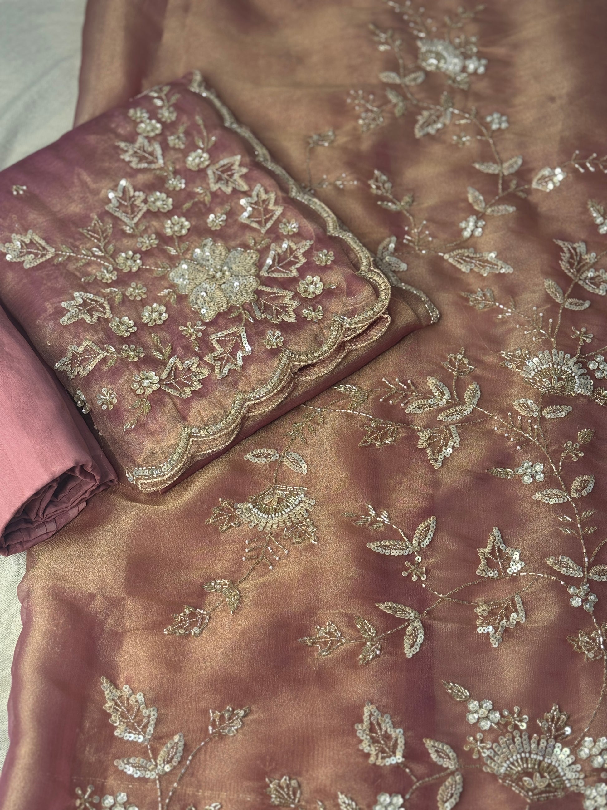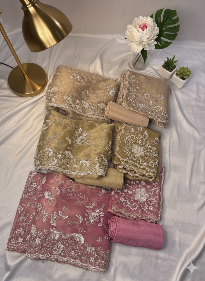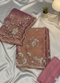 A luxurious suit set crafted in pure tissue organza material, adorned with all-over hand embroidery featuring delicate cutdana and sequin work for a shimmering, elegant finish. The dupatta is beautifully designed with matching intricate embroidery on all sides, enhancing its graceful appeal. Paired with pure crepe pants, offering a smooth and comfortable drape. This ensemble is an ideal pick for festive and wedding occasions, exuding timeless sophistication and rich craftsmanship.